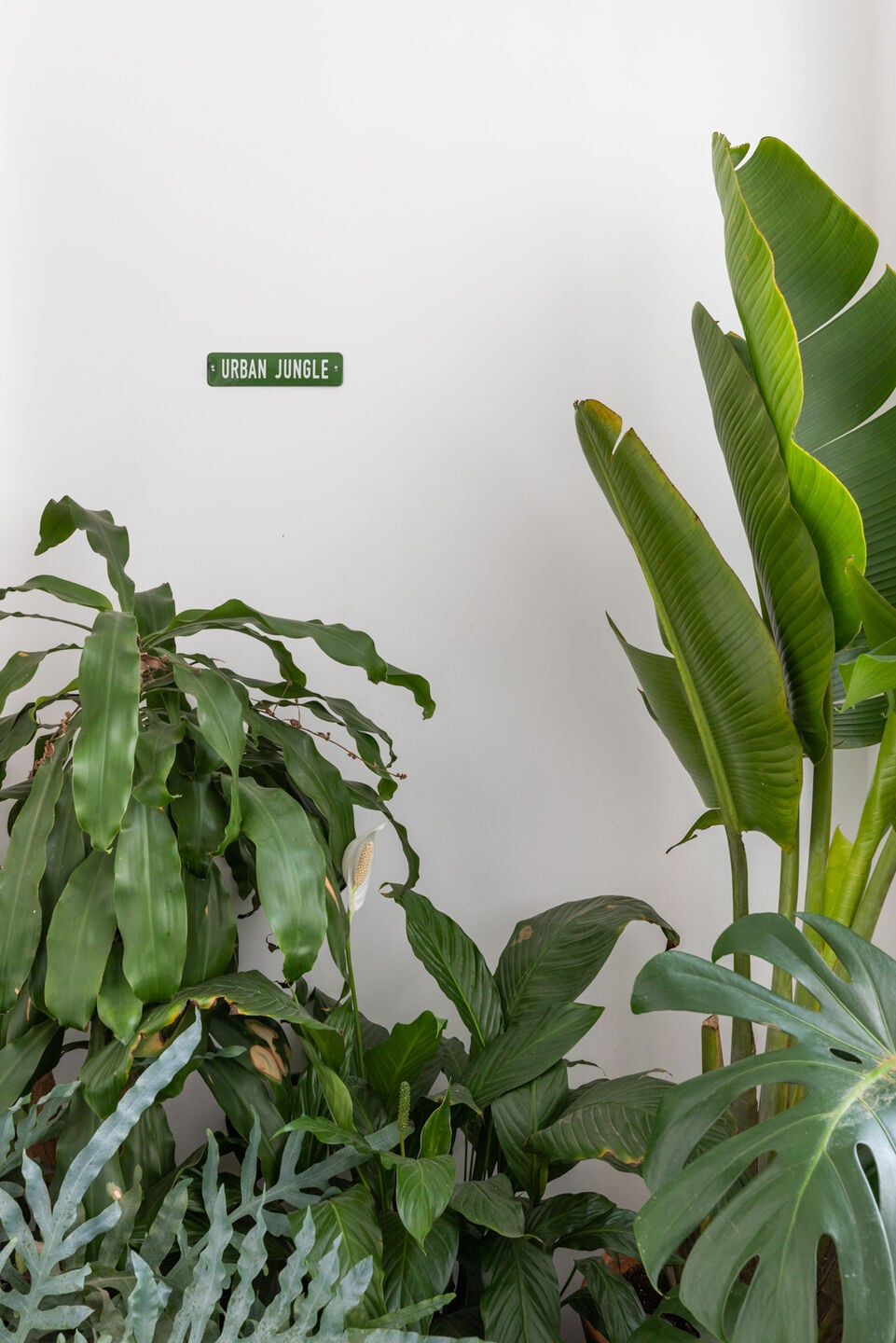 Mảng tường “Urban Jungle” với các loại cây lá to bản mang lại cảm giác như một khu vườn mini. Đây là điểm nhấn xanh mát, cân bằng không khí cho căn hộ