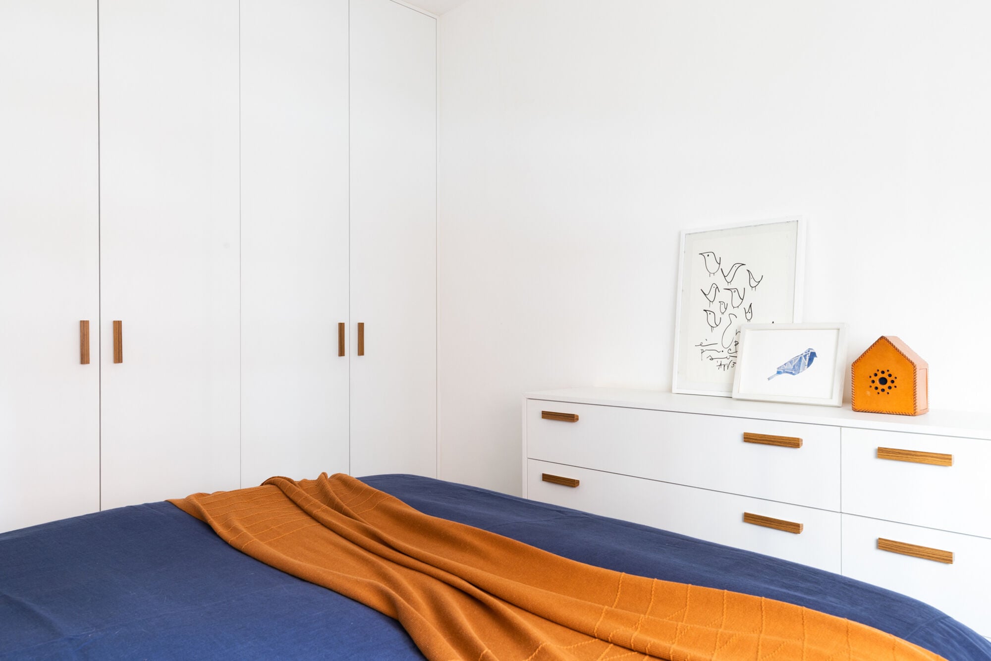 Không gian nghỉ ngơi được thiết kế nhẹ nhàng, nhấn vào cảm giác ấm áp hơn là sự cầu kỳ. Cặp màu xanh navy và cam đất được phối hợp khéo léo, mang lại sự cân bằng giữa tươi mát và ấm cúng. Ga giường và gối ôm bằng vải cotton tạo cảm giác thoải mái khi chạm vào.