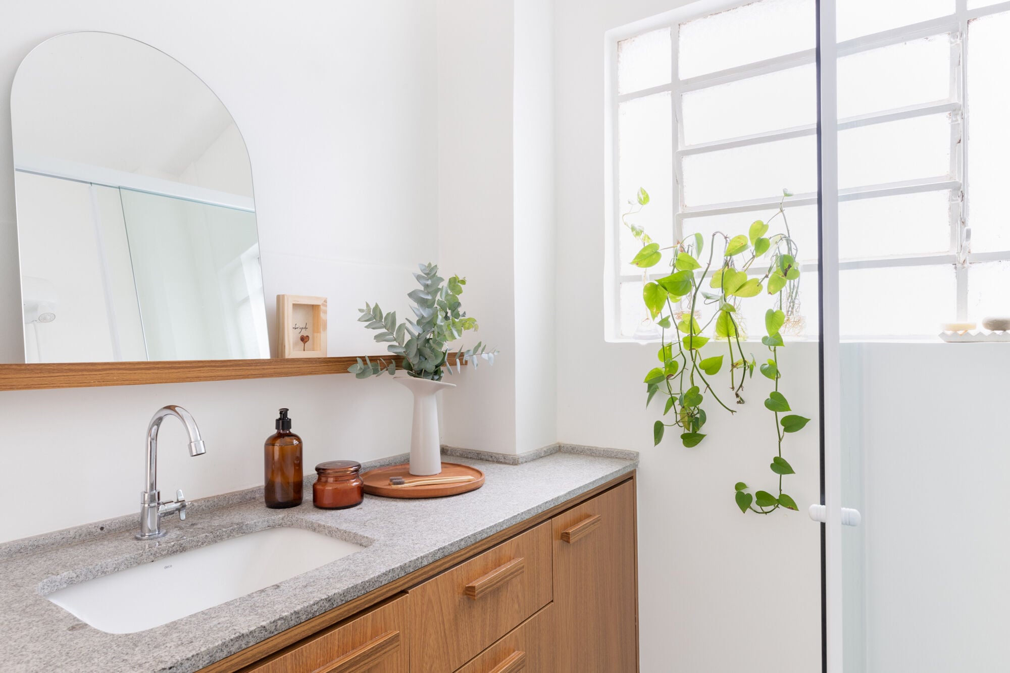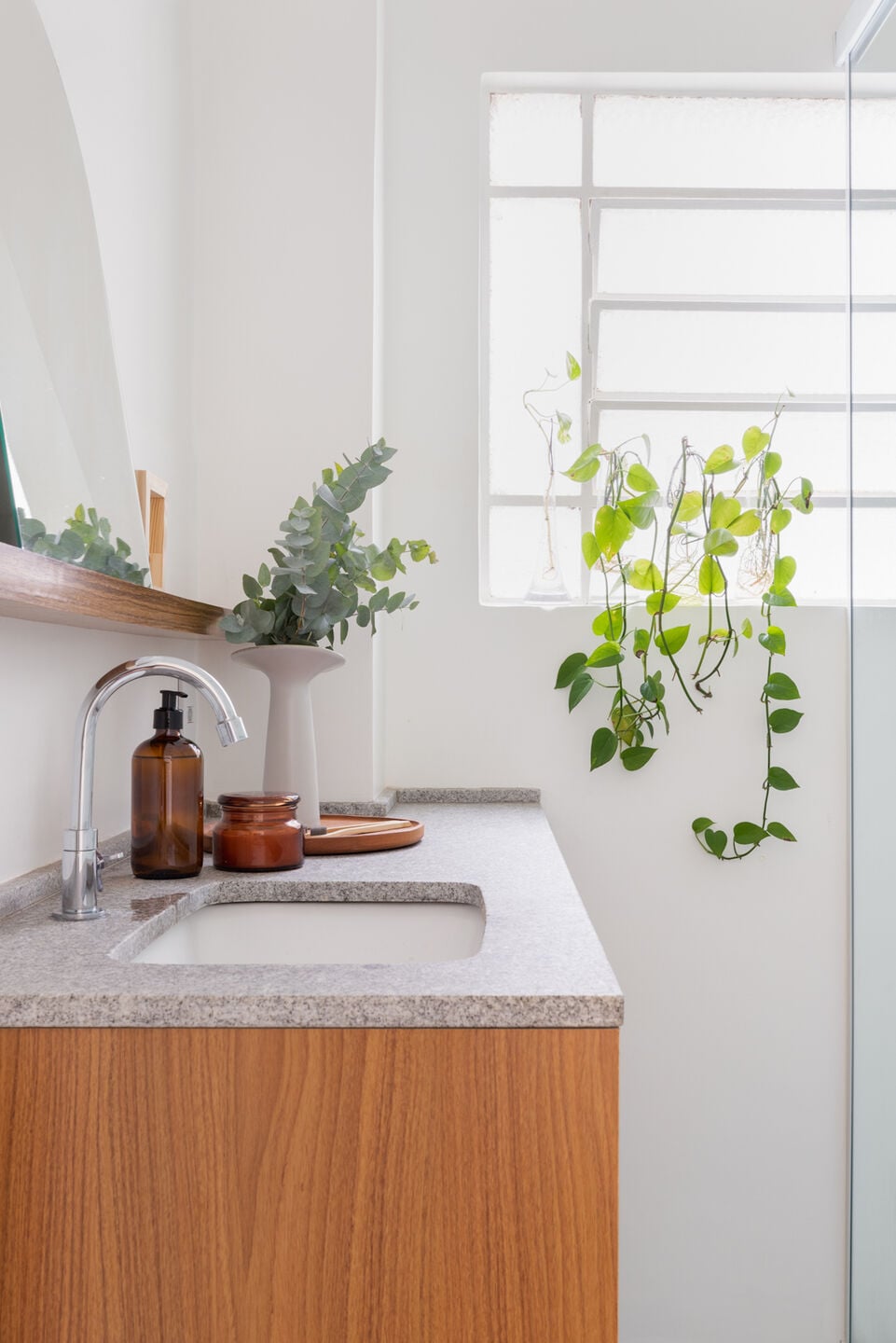 Lavabo được bố trí gọn gàng, sáng sủa với cây xanh làm điểm nhấn. Mặt bàn đá và đồ dùng tối giản tạo cảm giác sạch sẽ, thư giãn