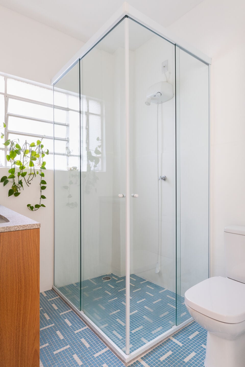 Buồng tắm kính trong suốt giúp không gian nhỏ vẫn thoáng và sáng. Sàn gạch mosaic xanh mang lại cảm giác đồng nhất với phong cách nhẹ nhàng của toàn căn hộ