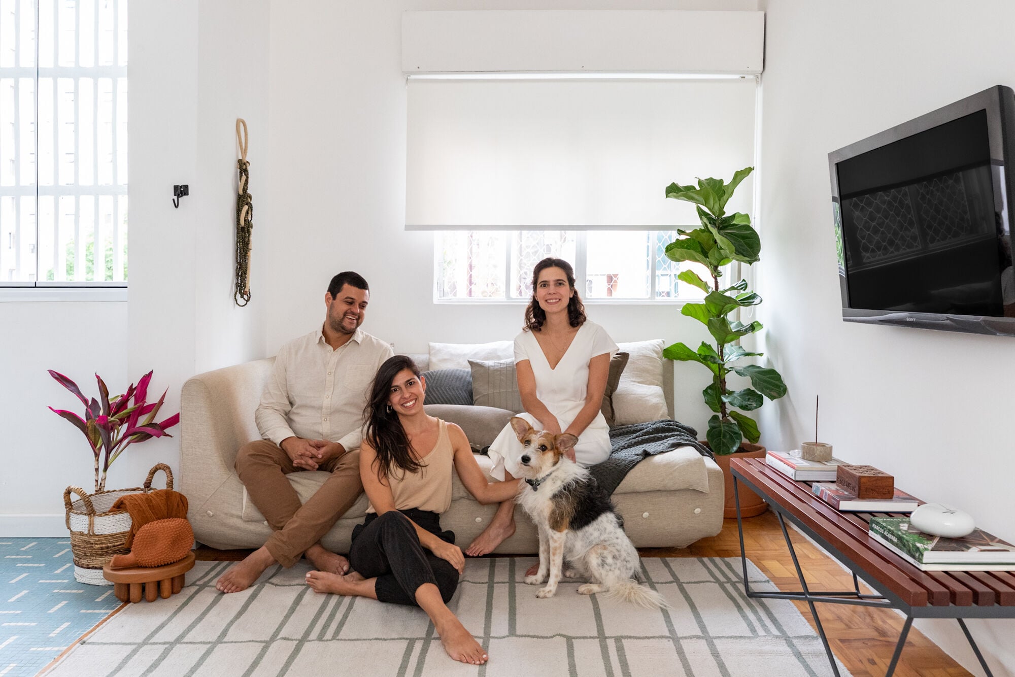 Cặp vợ chồng trẻ cùng chú chó nhỏ trong không gian phòng khách ấm cúng. Thiết kế nhẹ nhàng, gần gũi, thể hiện đúng tinh thần sống chậm và tận hưởng của chủ nhà