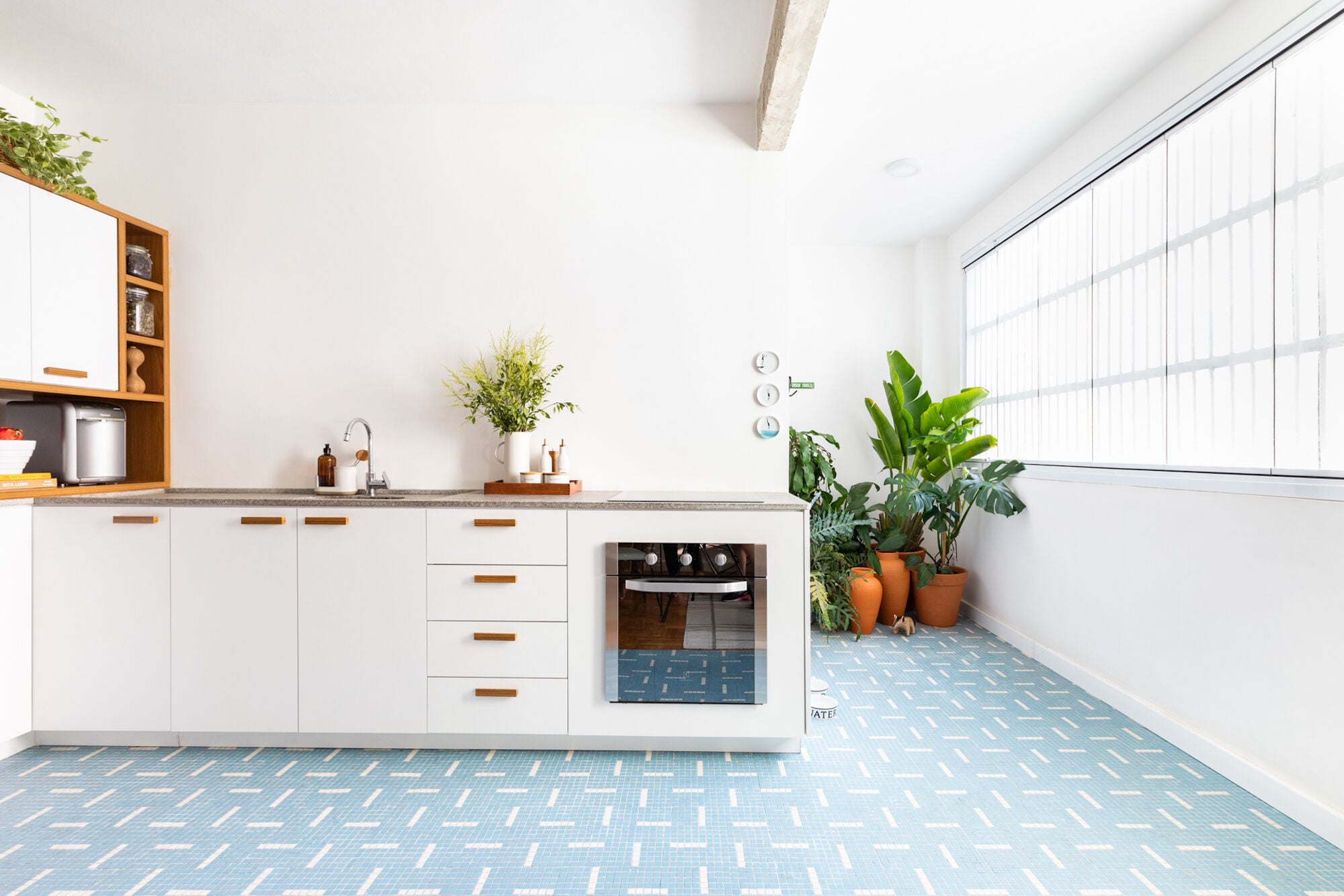 Không gian sinh hoạt chung được mở hoàn toàn, kết nối liền mạch giữa bếp, bàn ăn và phòng khách. Ánh sáng tự nhiên tràn ngập, sàn gỗ và gạch mosaic xanh giúp căn hộ nhỏ trở nên tươi sáng và ấm áp