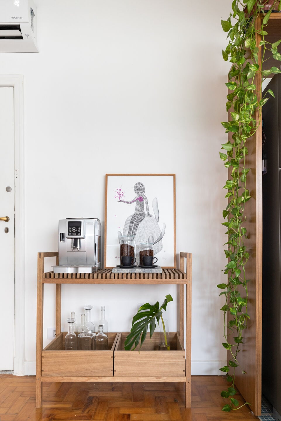 Góc pha cà phê nhỏ gọn với bàn gỗ tự nhiên và tranh treo nghệ thuật tối giản. Dây leo xanh giúp không gian thêm mềm mại và tràn sức sống