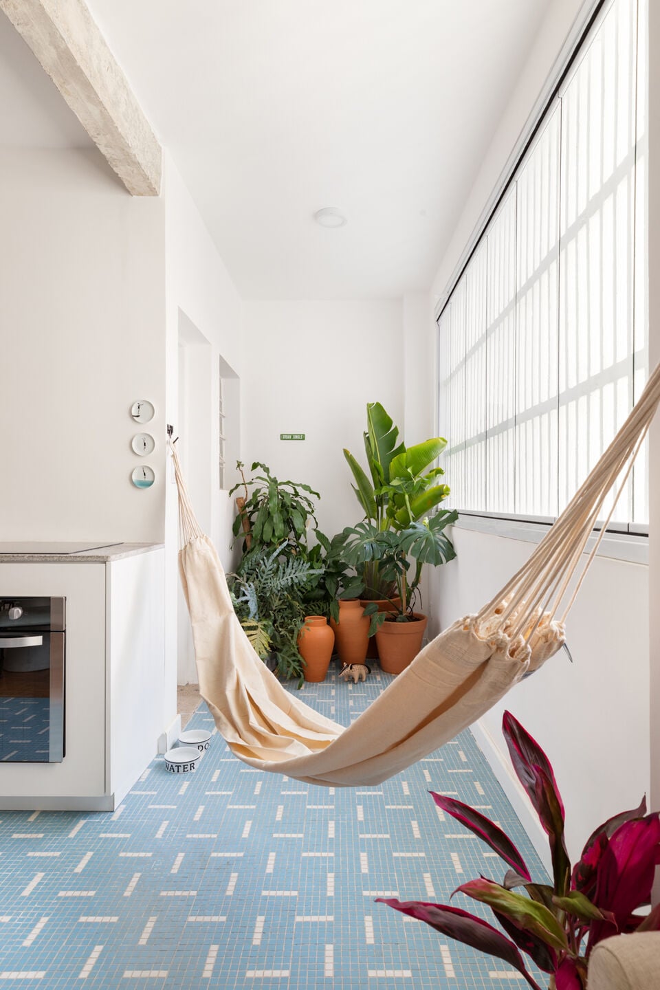 Khu vực ban công trong nhà được thiết kế như một góc thư giãn xanh mát. Võng vải nhẹ và chậu cây lớn giúp gia chủ tận hưởng không khí tự nhiên giữa lòng thành phố