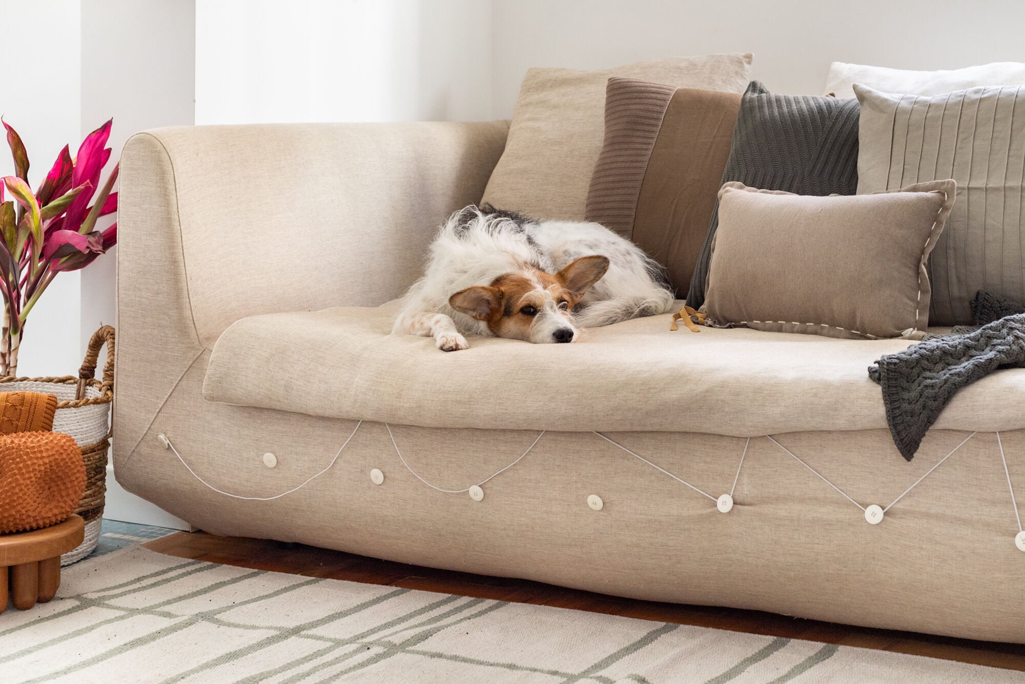 Chú chó nhỏ nằm nghỉ trên sofa màu be mềm mại - điểm nhấn ấm áp trong căn hộ. Tông màu trung tính cùng chất liệu vải tự nhiên tạo cảm giác bình yên và thân thuộc.