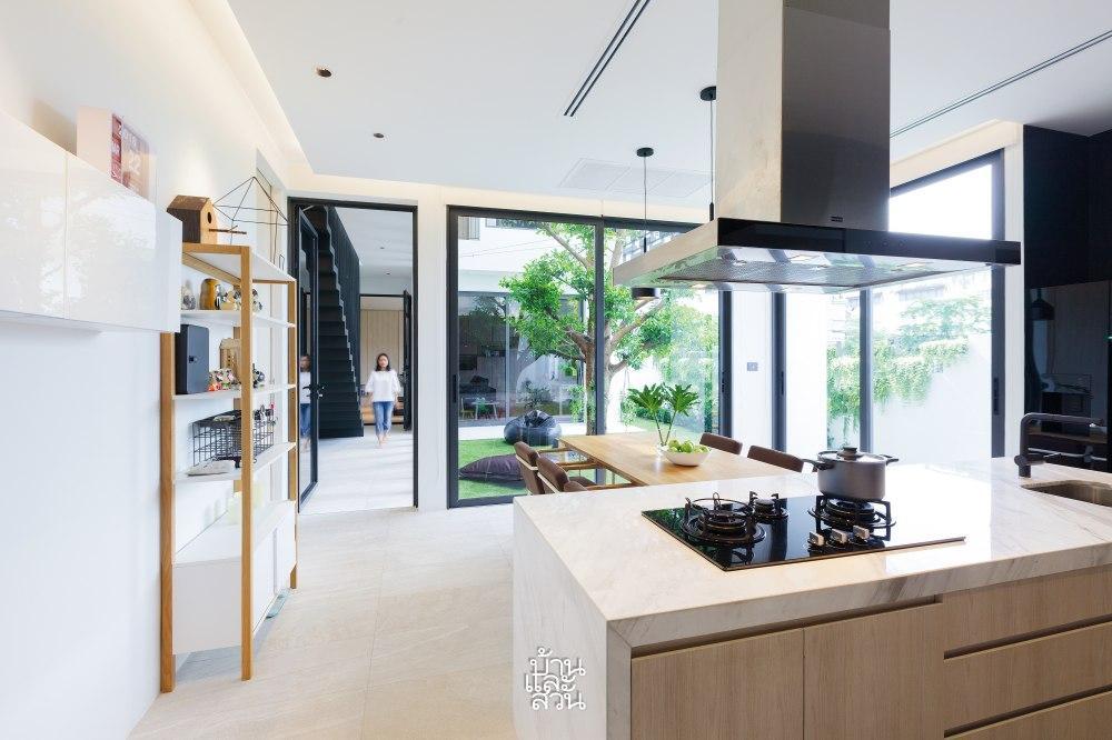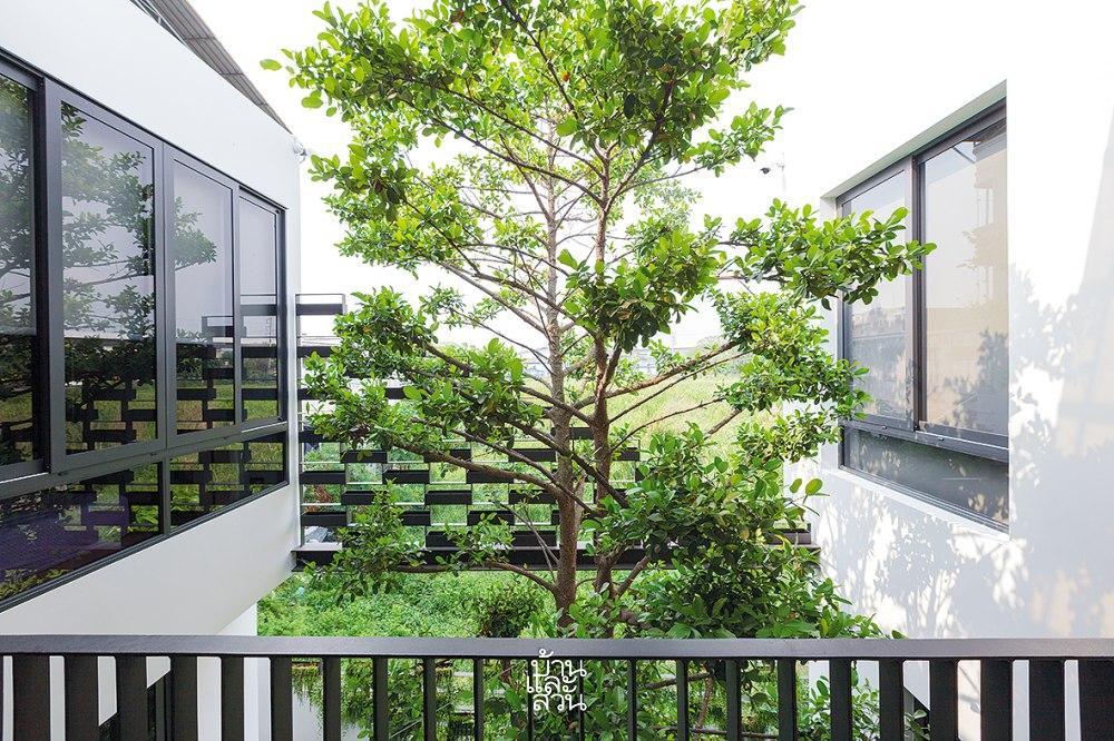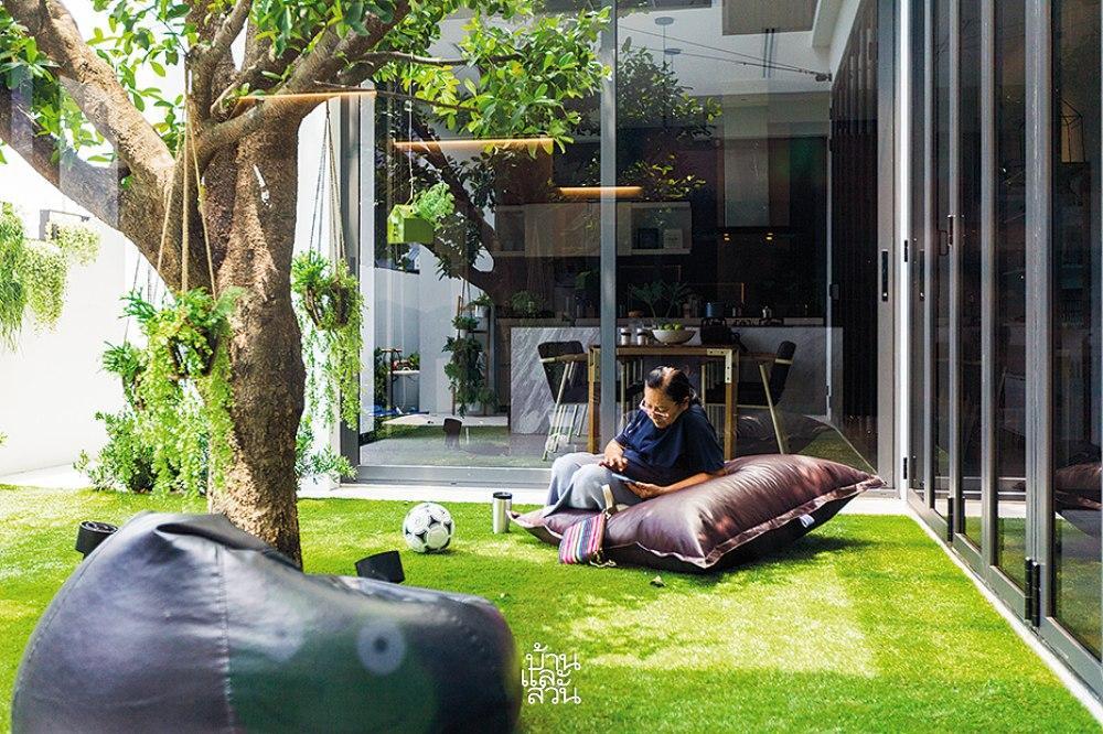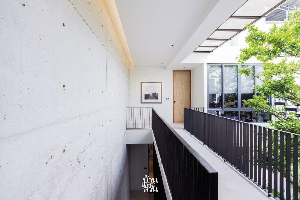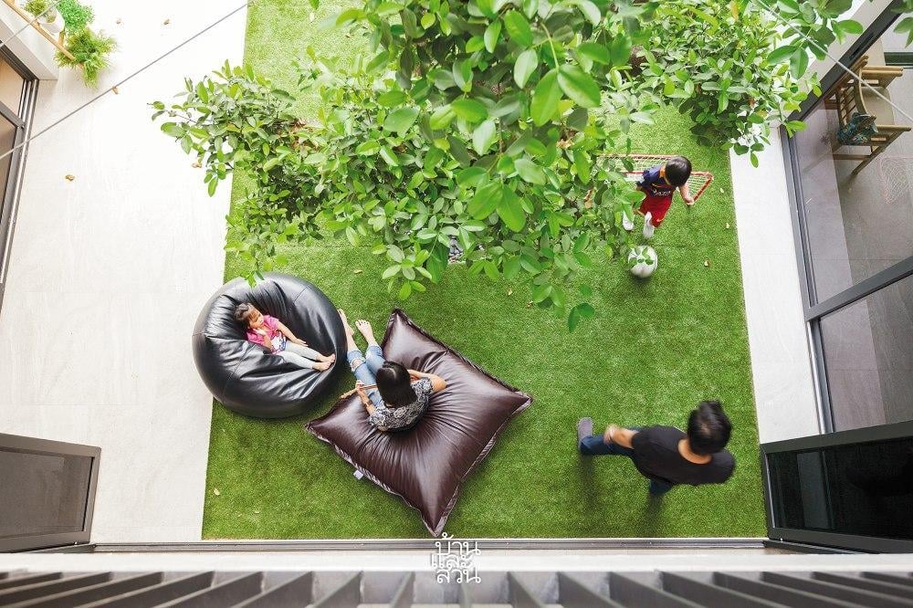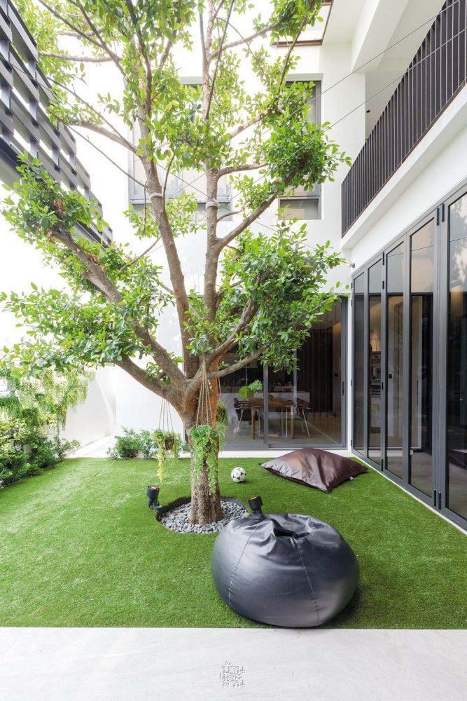 Vì mảnh đất có đặc thù hẹp chiều ngang nhưng lại sâu về chiều dài, việc lấy sáng và gió trở thành bài toán thú vị. Giải pháp được đưa ra là kiến tạo một khoảng sân trong ngay tại trung tâm, chia tách khối nhà thành hai phần chức năng riêng biệt kết nối bởi hành lang, nâng tổng diện tích sử dụng lên đến gần 300m2. Tại đây, một cây Màng Tang mang ý nghĩa thịnh vượng với tán lá rộng được di dời từ Saraburi về, đứng sừng sững như một người cận vệ già, tỏa bóng mát che chở cho cả gia đình.