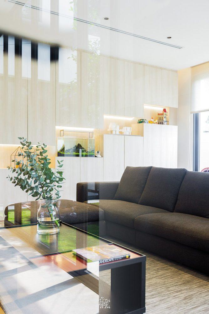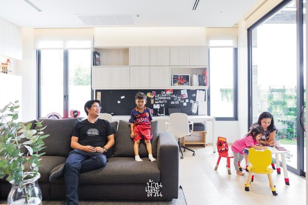 Kế tiếp đó là phòng khách, nơi tông màu trắng chủ đạo kết hợp cùng sàn gỗ kỹ thuật tạo nên cảm giác sạch sẽ và ấm cúng. Chiếc sofa kích thước lớn là nơi cả gia đình quây quần, bền bỉ cùng năm tháng dẫu có sự nghịch ngợm của trẻ nhỏ. Phía sau lưng sofa, một chiếc bàn dài được bố trí khéo léo để bố mẹ có thể vừa làm việc, vừa trông chừng con cái vui chơi hoặc ngắm nhìn khu vườn trung tâm.