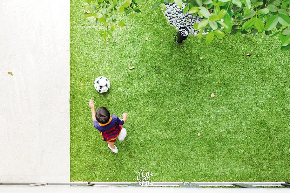 Khoảng sân nhỏ như trái tim của ngôi nhà, nơi lưu giữ những khoảnh khắc bình yên nhất. Đó là nơi người cha cùng con trai chơi bóng, nơi người mẹ ngồi thư giãn đón gió chiều, hay đơn giản là góc nhỏ để cô con gái ngắm nhìn bầu trời xanh qua kẽ lá. Dù đứng ở bất kỳ đâu, từ phòng khách tầng trệt hay phòng ngủ trên lầu, các thành viên đều có thể chạm mắt vào màu xanh dịu mát của thiên nhiên.