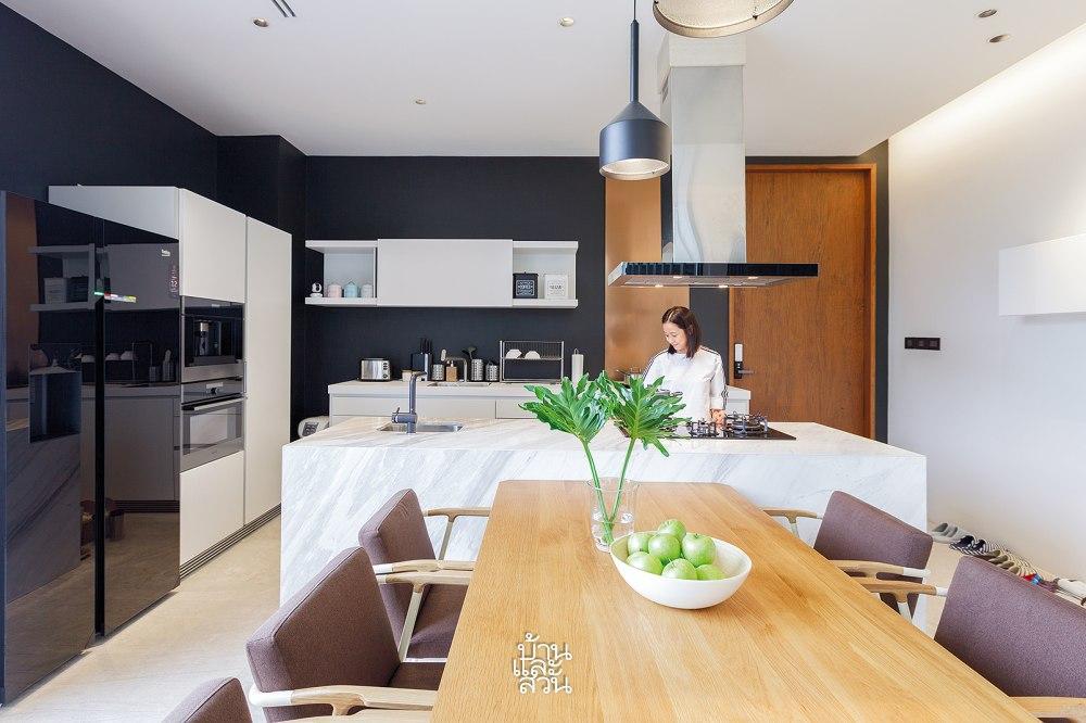 Thay vì phòng khách, không gian đầu tiên chào đón người về là khu vực bếp và bàn ăn. Đây là ý đồ đầy tinh tế của gia chủ, bởi những vị khách ghé thăm đều là bạn bè thân thiết, không cần những nghi thức xã giao rườm rà. Ngôi nhà vận hành gọn gàng như một căn hộ condominium tiện nghi. Hơn nữa, gia đình cũng thường xuyên sử dụng căn bếp lớn của nhà mẹ ngay bên cạnh cho những nhu cầu nấu nướng phức tạp hơn.