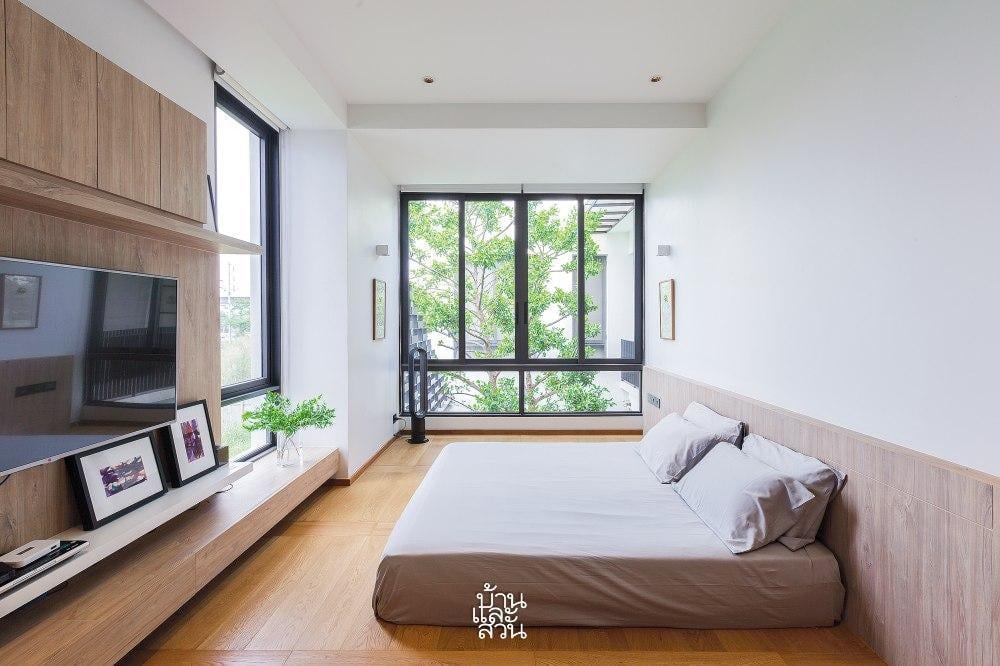Phòng ngủ của gia đình được thiết kế tối giản với tông trắng và gỗ sồi, hạn chế tối đa đồ đạc để tâm trí được nghỉ ngơi. Những ô cửa sổ được trổ khéo léo, đóng vai trò như những khung tranh sống động, thu trọn màu xanh của tán cây Màng Tang vào tầm mắt.