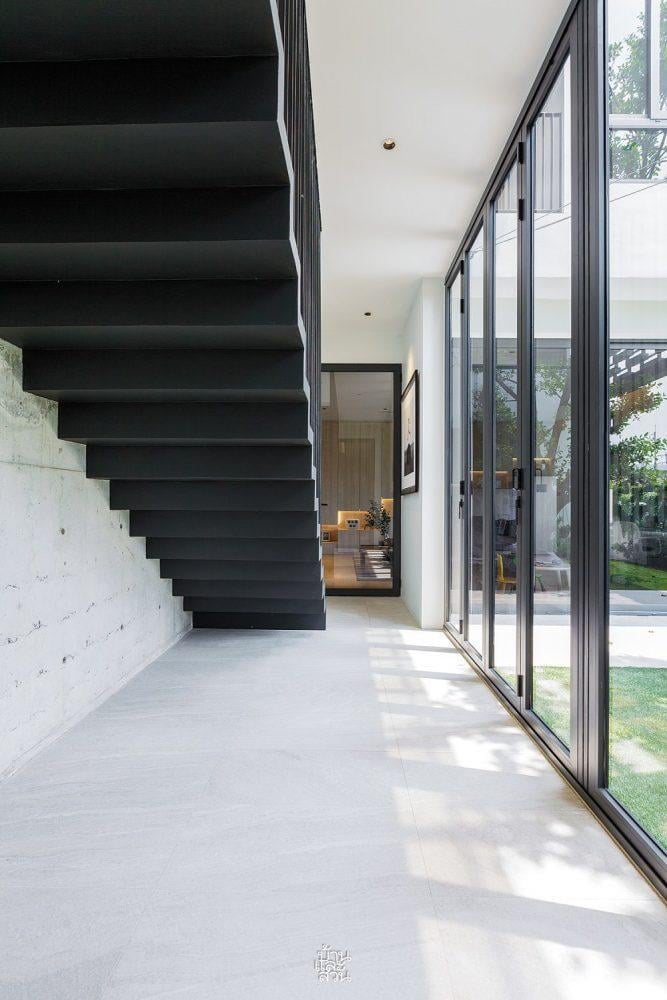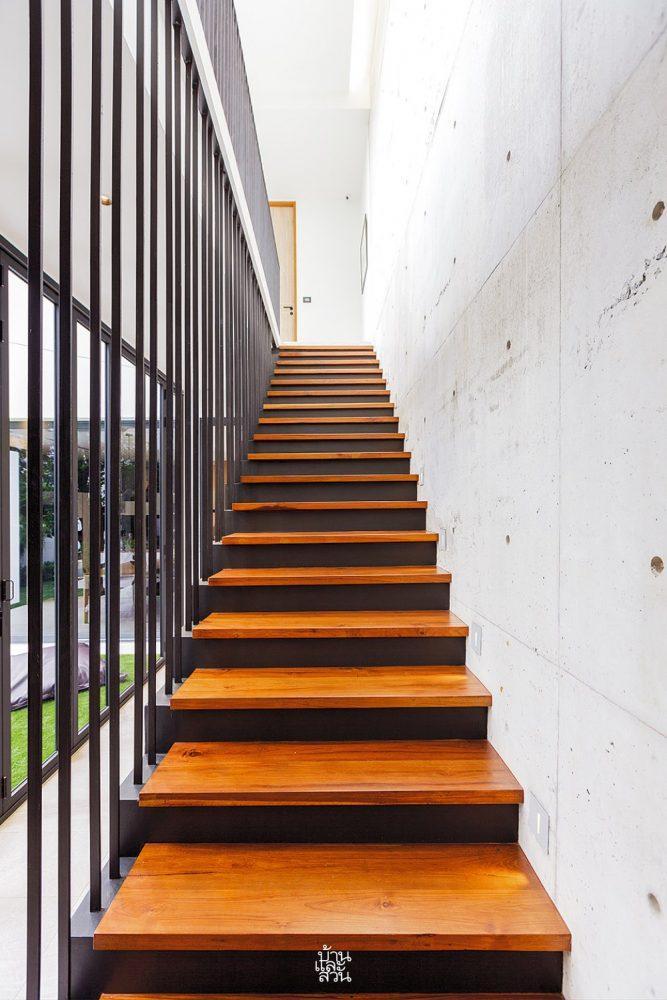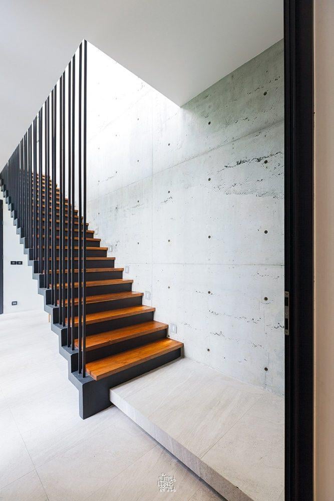 Cầu thang bay nhẹ nhàng dẫn lối lên các tầng trên, được bao bọc bởi những bức tường bê tông thô mộc đầy cá tính