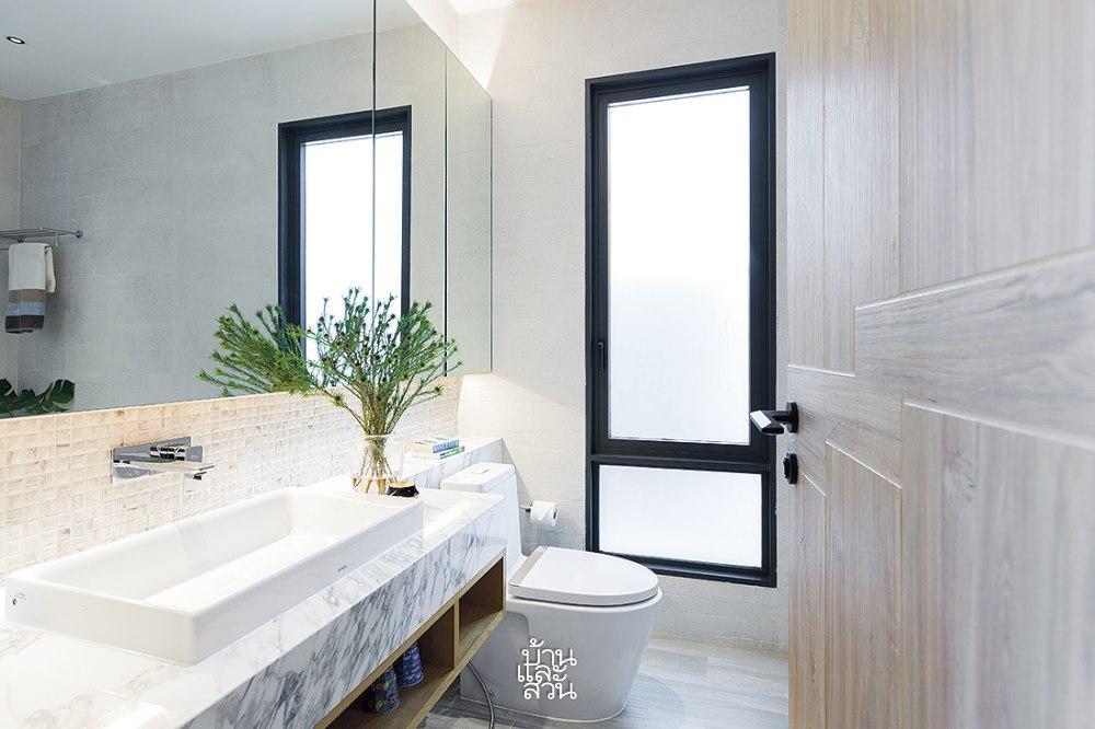 Phòng tắm sáng màu mở cửa sổ đón ánh sáng tự nhiên, kết hợp hệ thống gương lớn giúp căn phòng rộng hơn