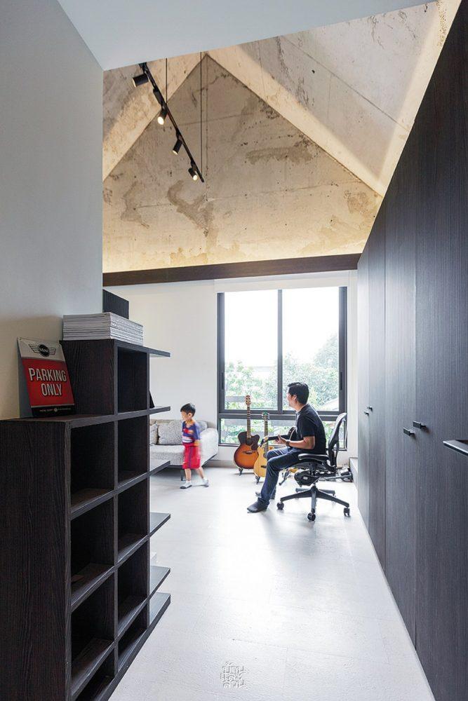 Trần nhà không đóng phẳng mà để lộ kết cấu bê tông đúc dốc theo hình dáng mái nhà. Thiết kế không chỉ giúp trần cao và thoáng hơn mà còn tạo ra một lớp đệm không khí cách nhiệt, giữ cho không gian bên dưới luôn mát mẻ mà không cần phụ thuộc quá nhiều vào điều hòa.