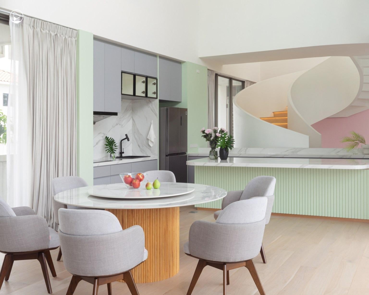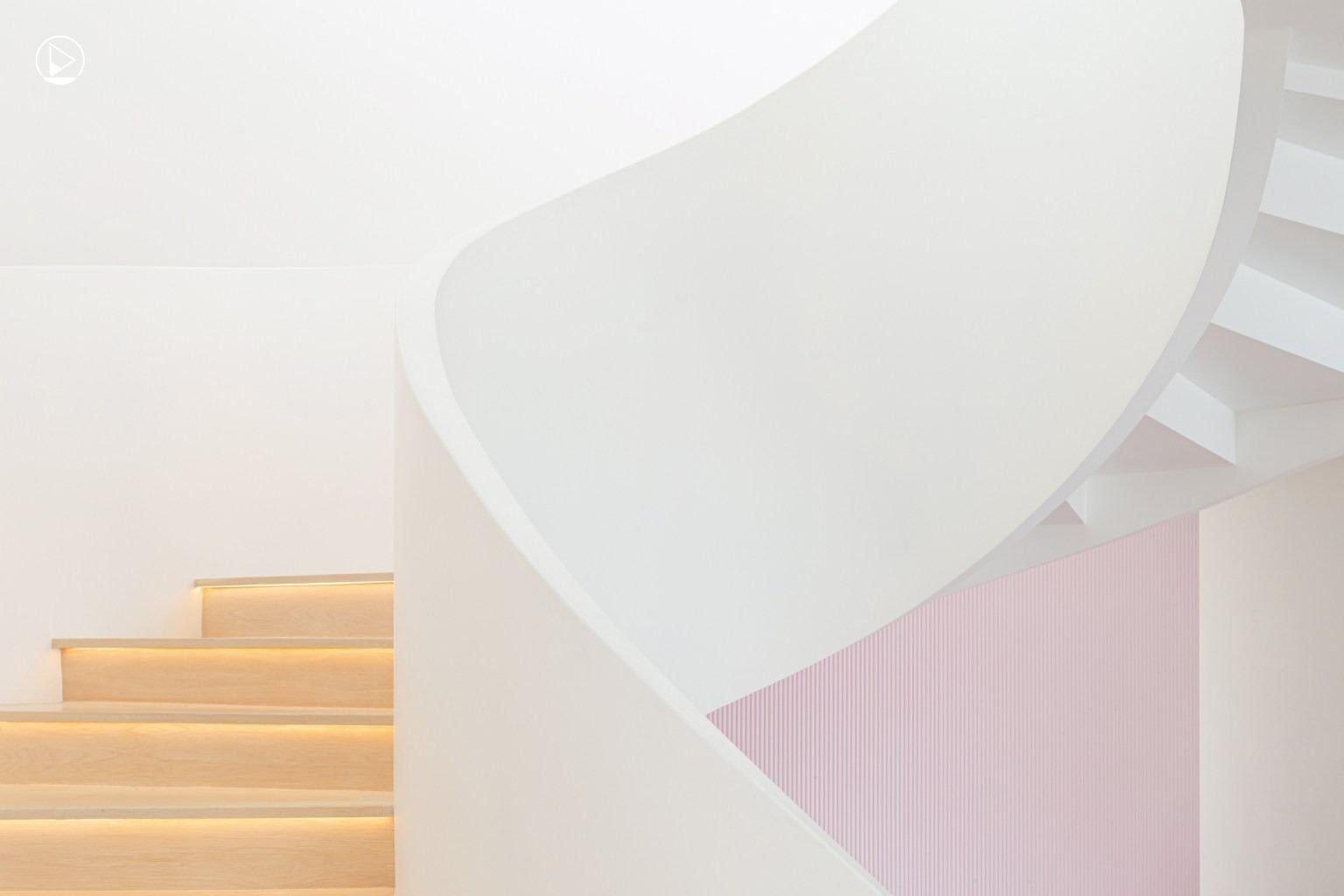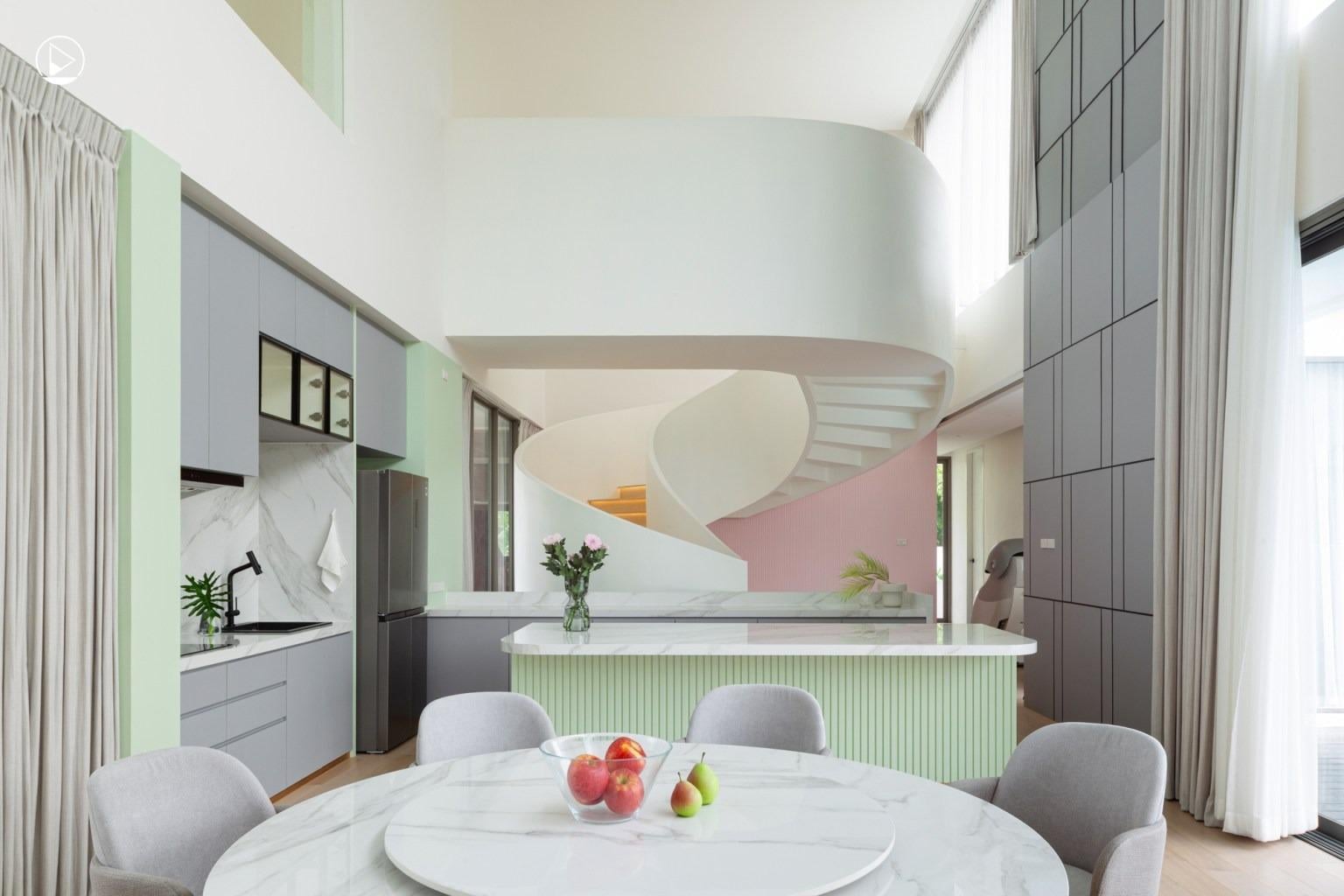 Cầu thang xoắn giữa nhà không chỉ kết nối các tầng, mà còn là tác phẩm điêu khắc ấn tượng. Tường màu hồng tương phản với sàn đá xanh, và nội thất gỗ tông ấm cân bằng cả hai, tạo không khí ấm áp nhưng tươi sáng độc đáo.