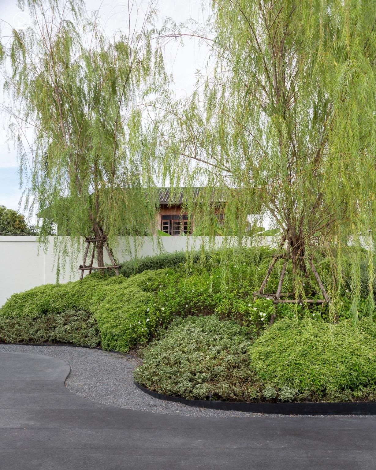 Thiết kế cảnh quan bắt đầu từ yêu cầu rõ ràng của gia chủ: đơn giản, dễ chăm sóc. Cây lá rủ mềm mại được ưu tiên, để kiến tạo bầu không khí chung nhẹ nhàng và thân thiện