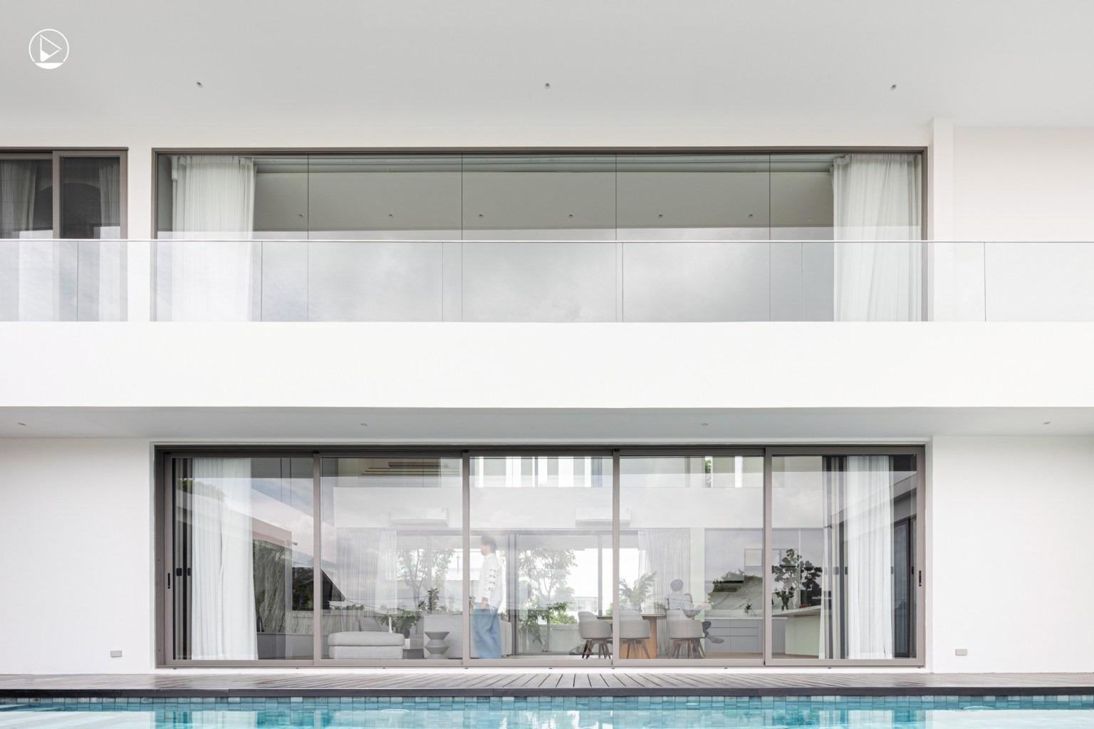 Bể bơi trở thành điểm trung tâm kết nối mọi không gian. Từ phòng khách, phòng ngủ, đến cả bếp của mẹ, mọi phòng đều có tầm nhìn hội tụ tại đó