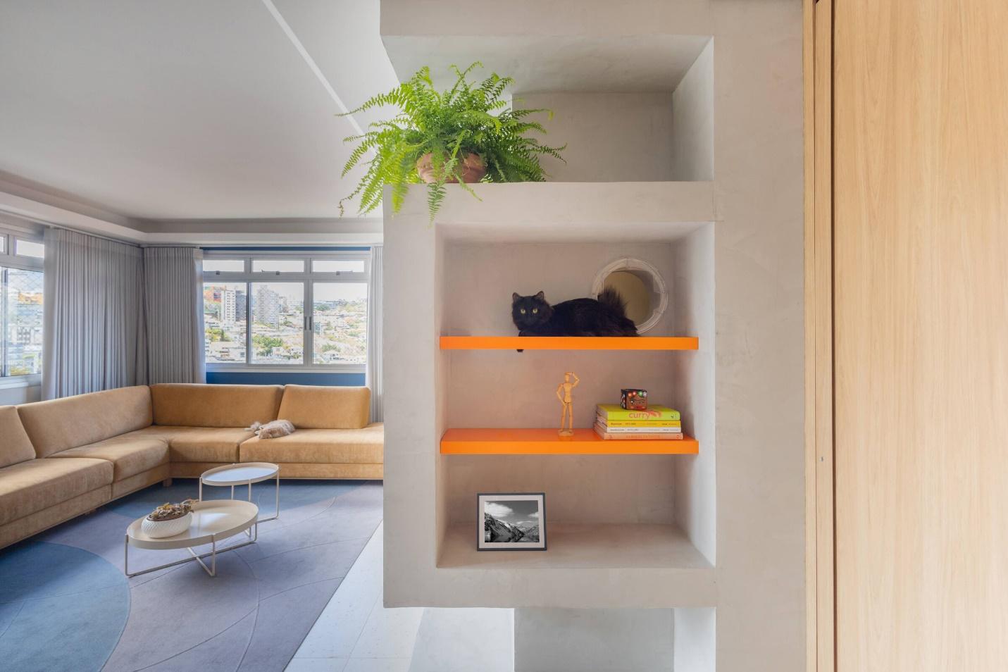 Điều đáng chú ý ở căn hộ này là các giải pháp dành cho thú cưng được tích hợp ngay vào thiết kế đồ gỗ, thay vì chỉ là những đồ nội thất rời. Các lỗ tròn được bố trí khéo léo trong hệ thống tủ, tạo lối đi cho mèo giữa các phòng và lên các kệ cao, vừa tiện dụng vừa không ảnh hưởng đến thẩm mỹ chung.