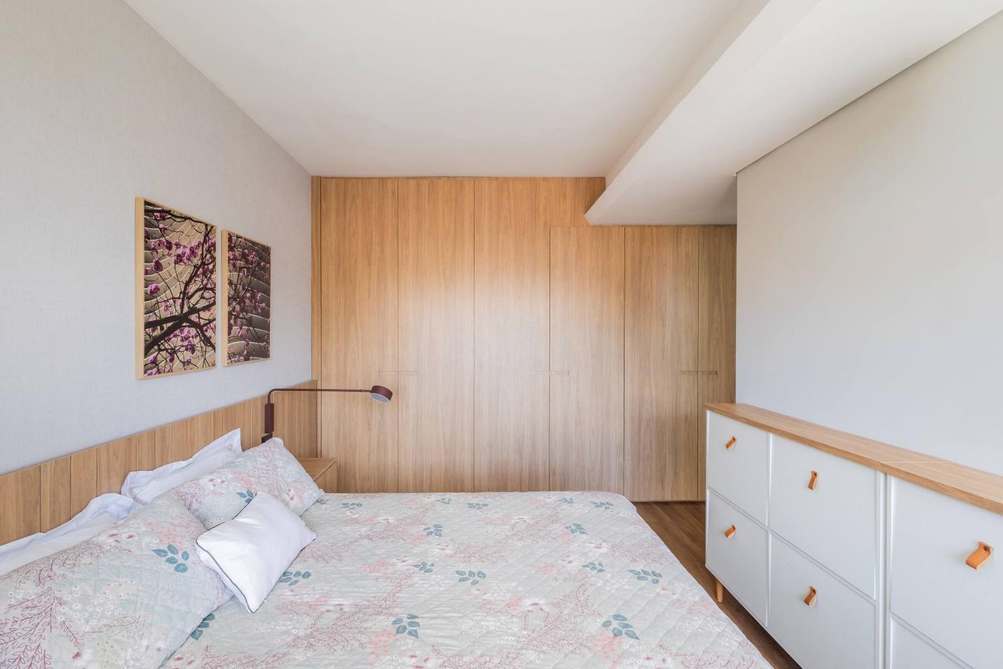 Phòng ngủ sử dụng ánh sáng tự nhiên và đèn gắn tường đơn giản, tạo ra một bầu không khí yên tĩnh và thư giãn. Tường sơn màu trắng giúp căn phòng trông rộng rãi và thoáng đãng hơn
