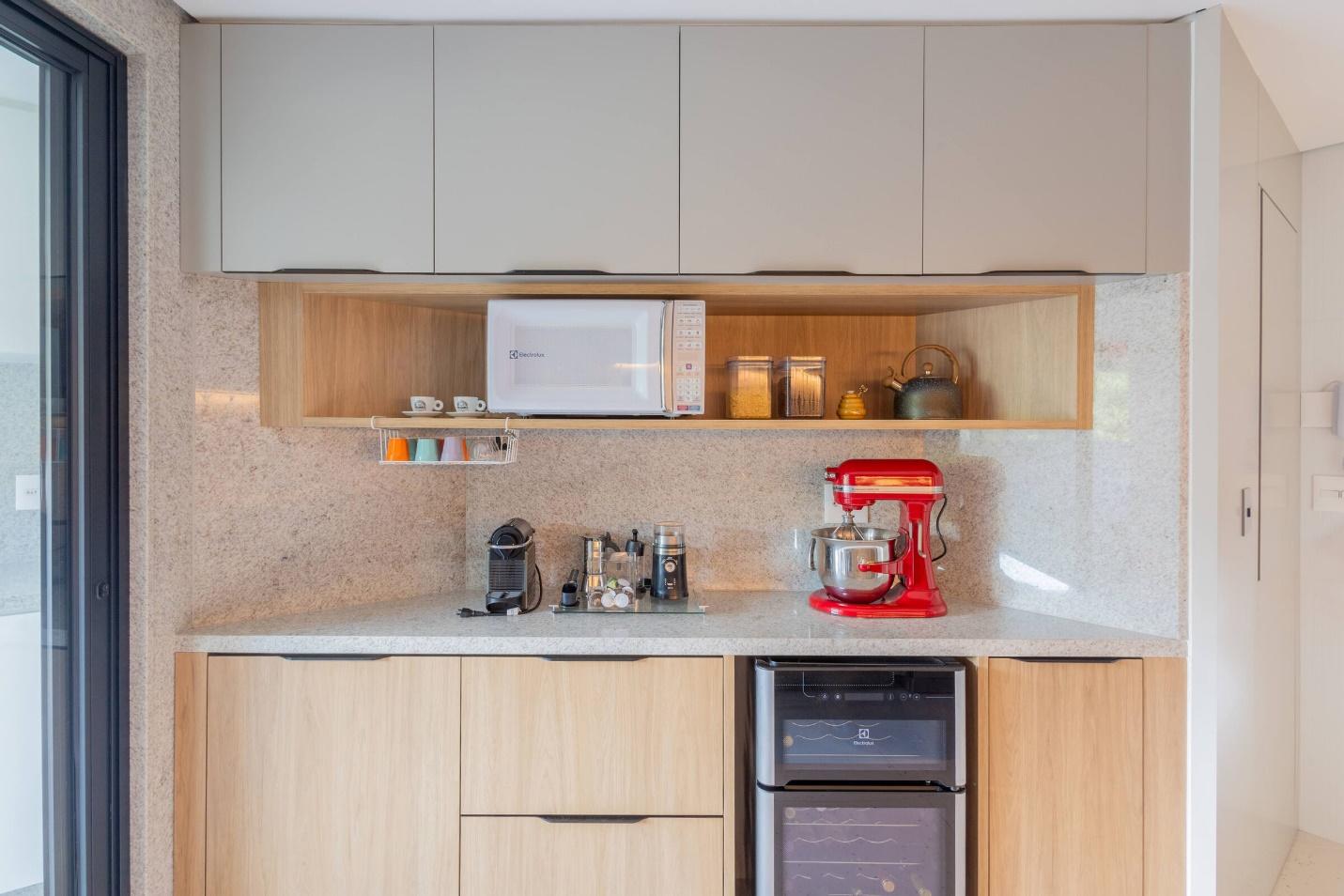 Không gian bếp hiện đại và đầy đủ tiện nghi. Mặt bếp và tường ốp đá granite màu sáng, tạo sự liền mạch và dễ vệ sinh