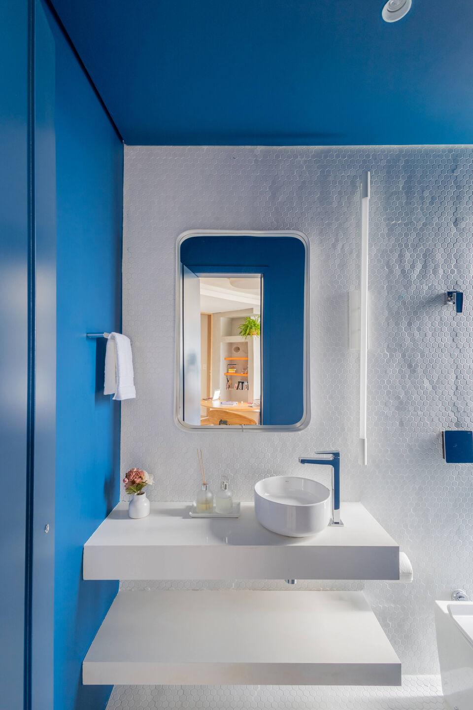 Phòng vệ sinh cho khách nổi bật với tông xanh dương đậm bao quanh từ trần đến tường. Cùng với gam trắng tinh khôi, không gian được thiết kế mang âm hưởng của đại dương xanh