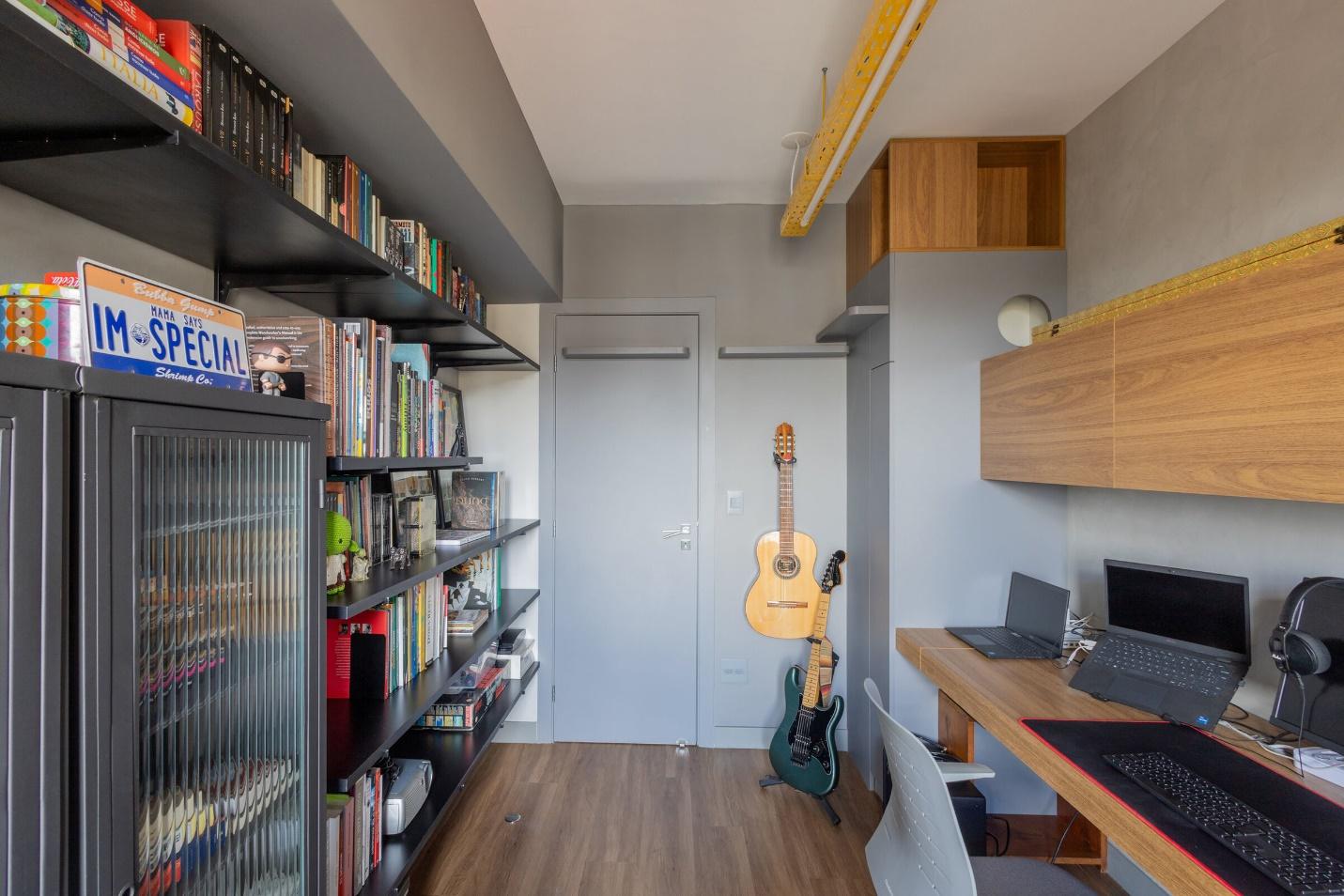 Bàn dài chạy dọc tường với kệ sách tích hợp và tủ kính trưng bày. Màu sắc trầm ổn giúp tăng sự tập trung