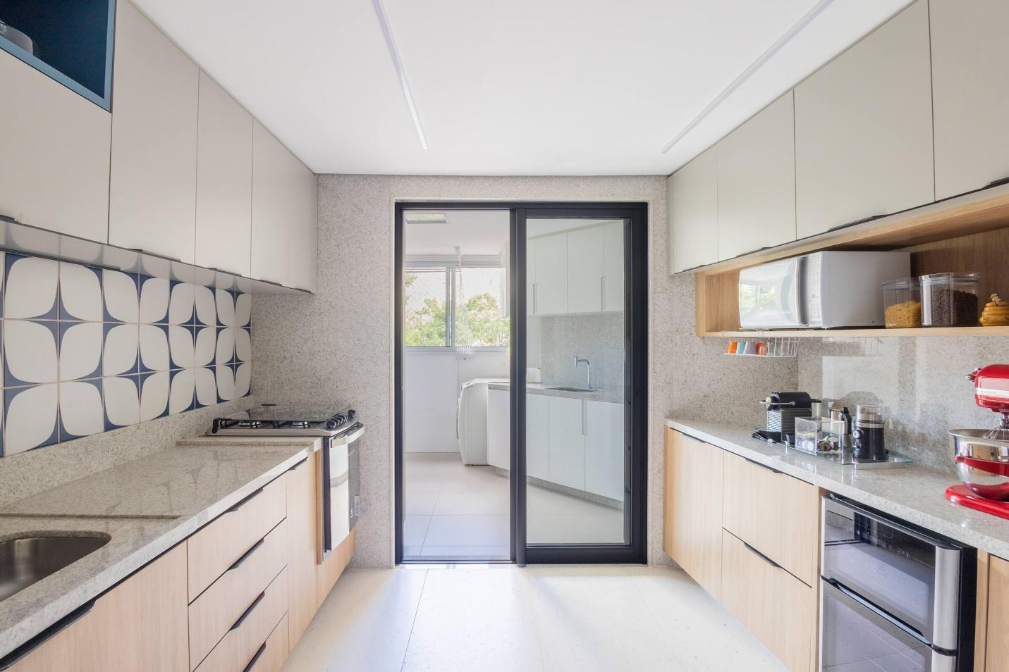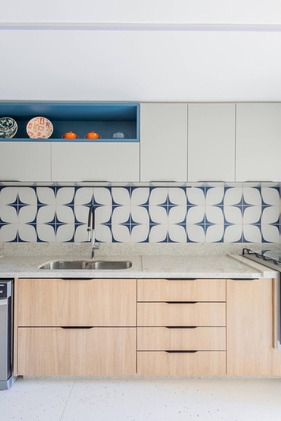 Gạch mosaic hoa văn trắng làm dịu sự mạnh mẽ của màu xanh. Kệ bếp gỗ sáng mang lại cảm giác ấm cúng, nhã nhặn
