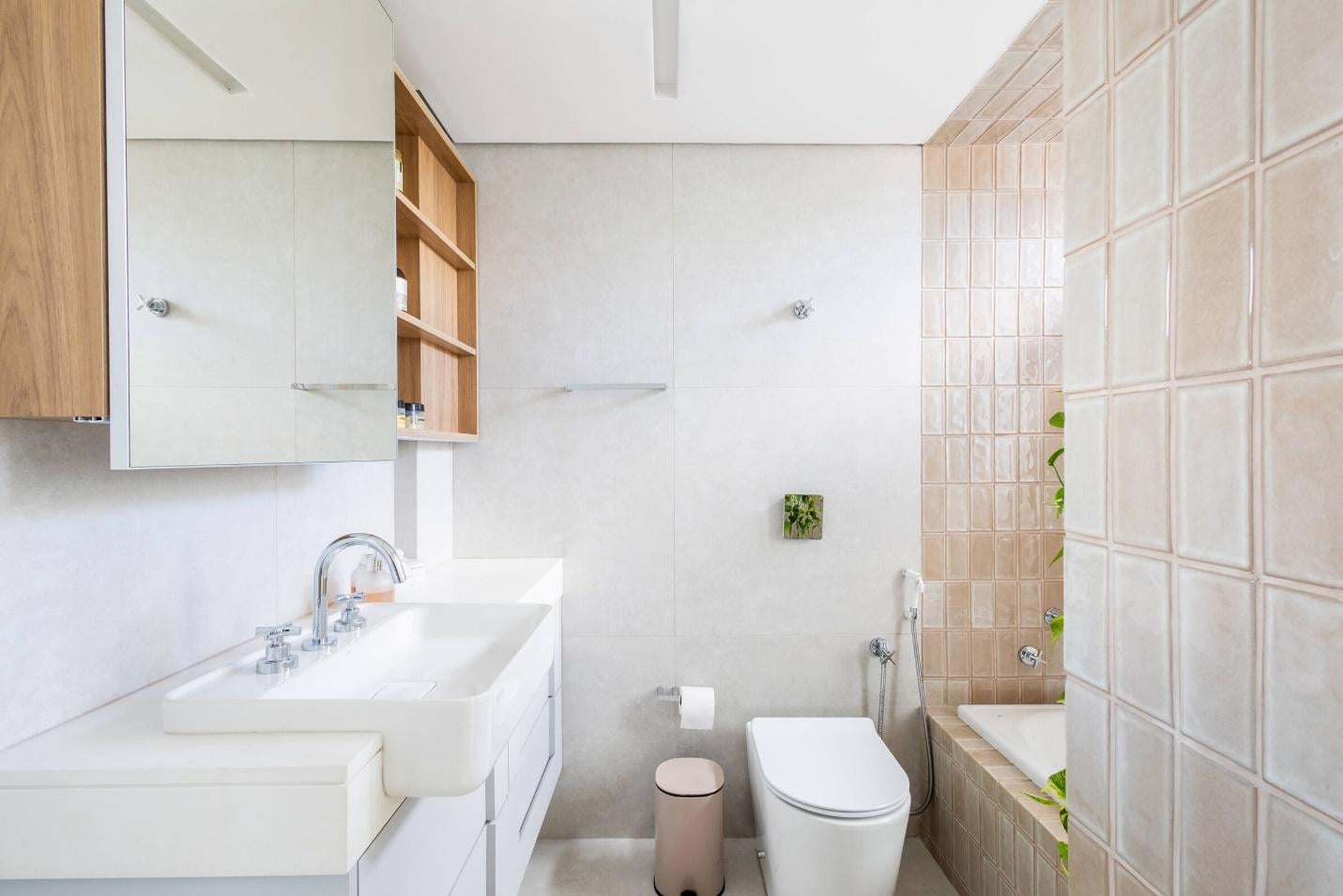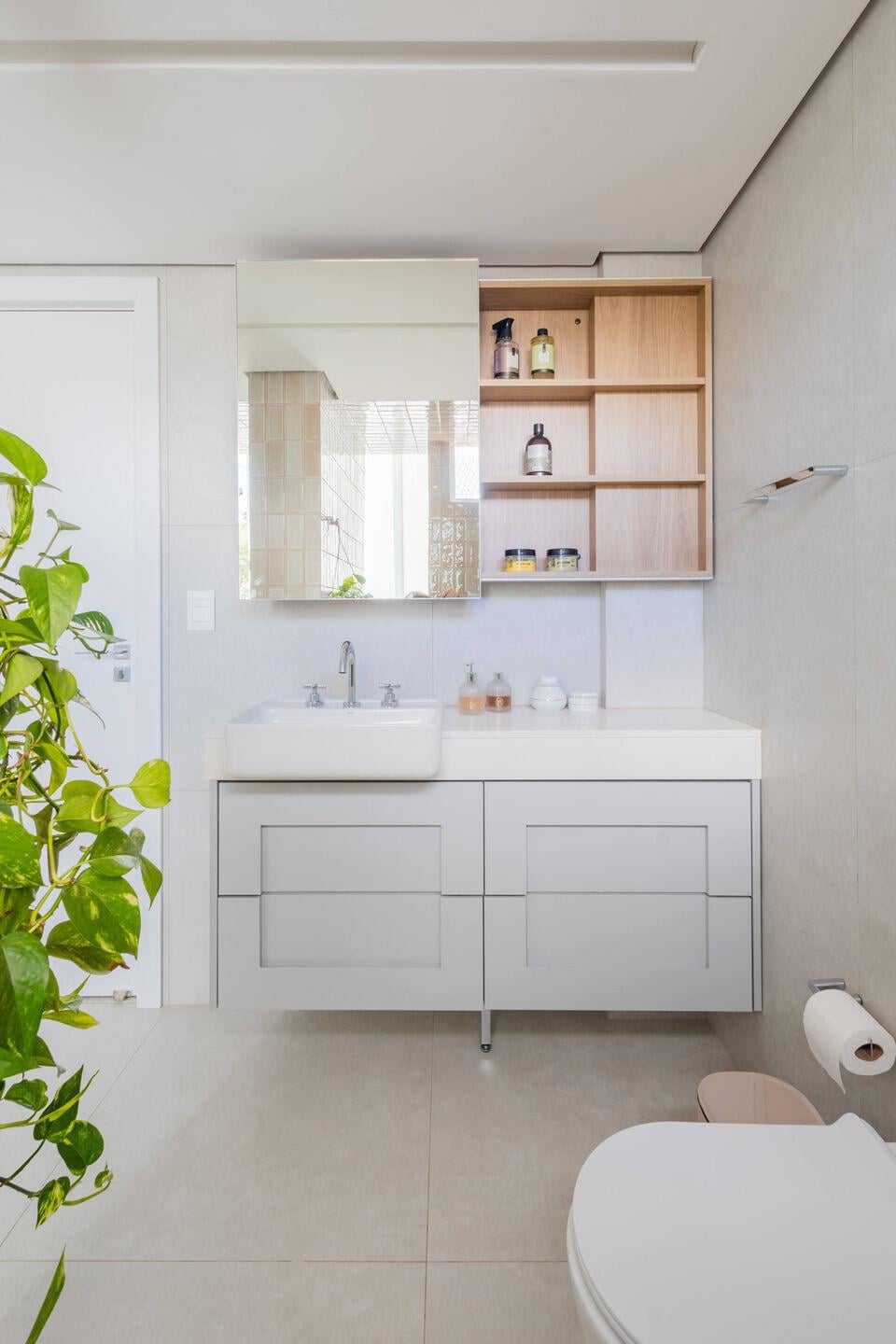 Phòng tắm sử dụng gạch ốp tường lớn màu trắng tinh tế. Sự phối hợp giữa màu xám, trắng và màu gỗ nhạt tạo nên một không gian hài hòa, thư giãn