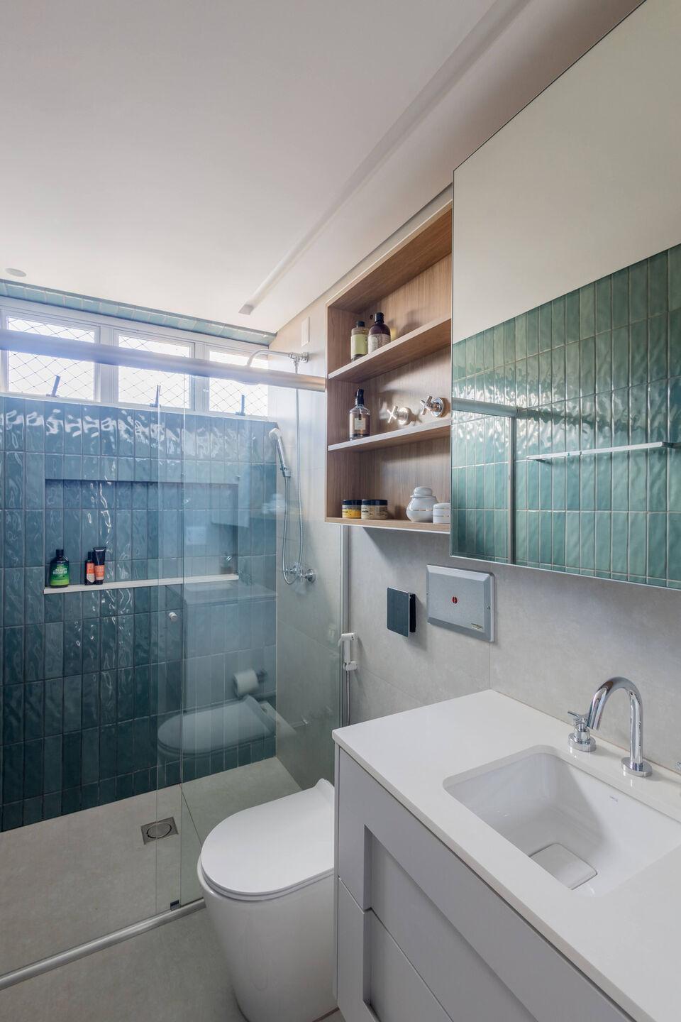 Phòng tắm chính sử dụng gạch men xanh lục ở khu vực tắm đứng, kết hợp với tủ lavabo trắng và kệ gỗ âm tường. Sự kết hợp tinh tế này mang sắc thái nhã nhặn mà vẫn giữ được sự sang trọng