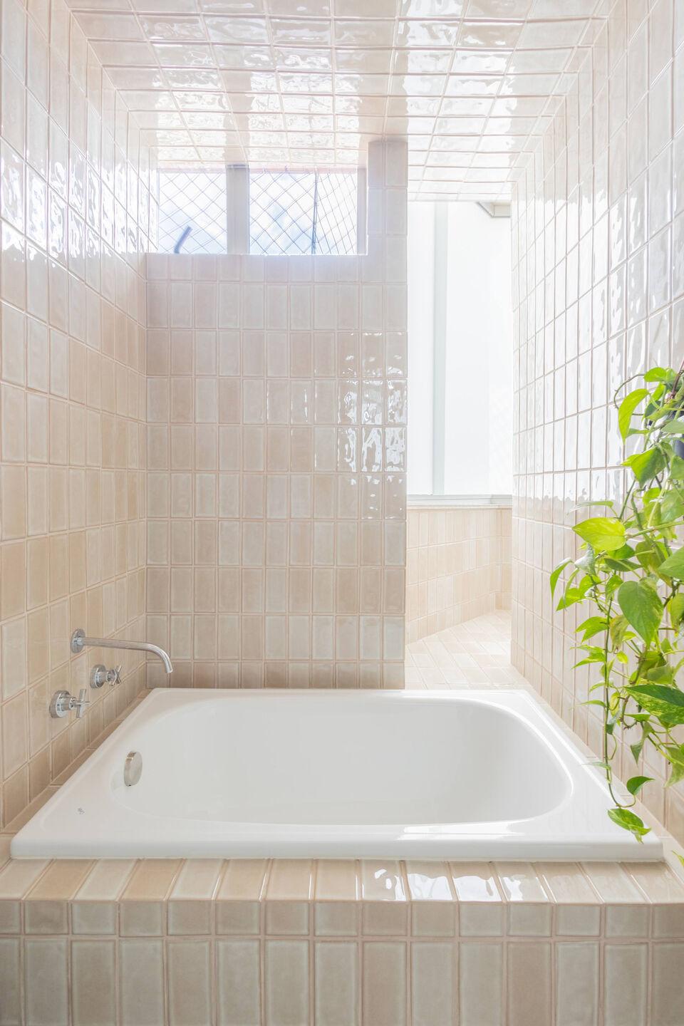 Gạch thẻ màu be nhạt tạo sắc thái sang trọng. Sự kết hợp giữa bồn tắm trắng tinh tế và gạch ốp màu be ấm áp mang lại sự thư giãn hoàn toàn cho gia chủ