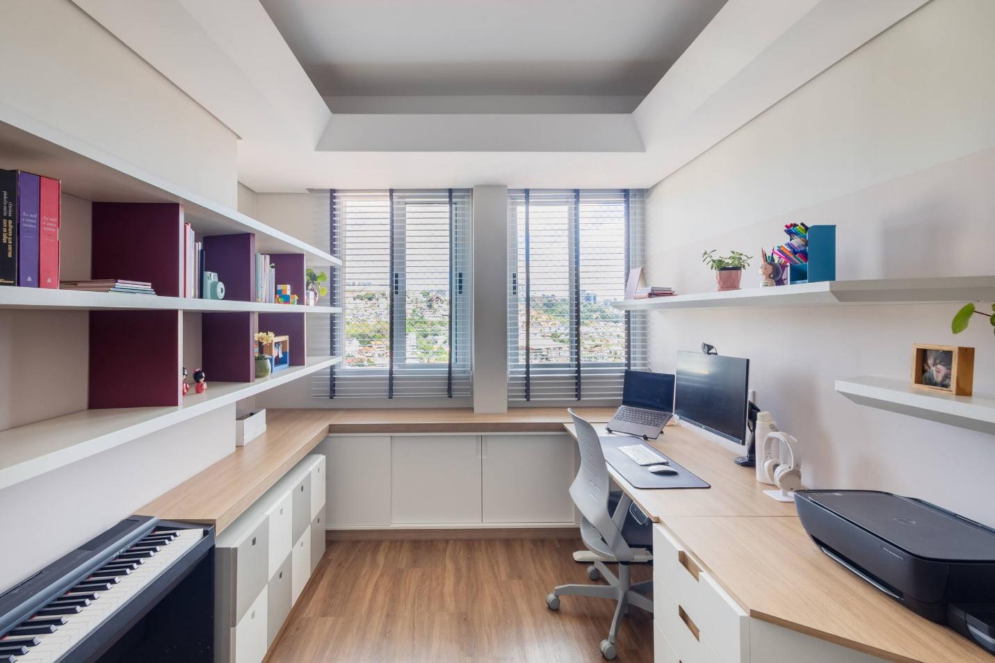 Qua việc phân bổ lại luồng giao thông, căn hộ Santa Lucia Apartment được phân vùng rõ ràng giữa khu vực sinh hoạt chung và không gian riêng tư, đồng thời bố trí hai văn phòng độc lập tại gia mà vẫn giữ được sự liền mạch của tổng thể.