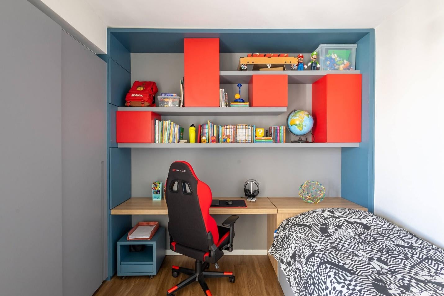 Phòng của bé cũng được tối ưu với bàn học tích hợp vào hệ thống kệ, khung xanh dương bao quanh tạo cảm giác riêng tư. Kệ màu đỏ cam nổi bật kích thích sự sáng tạo