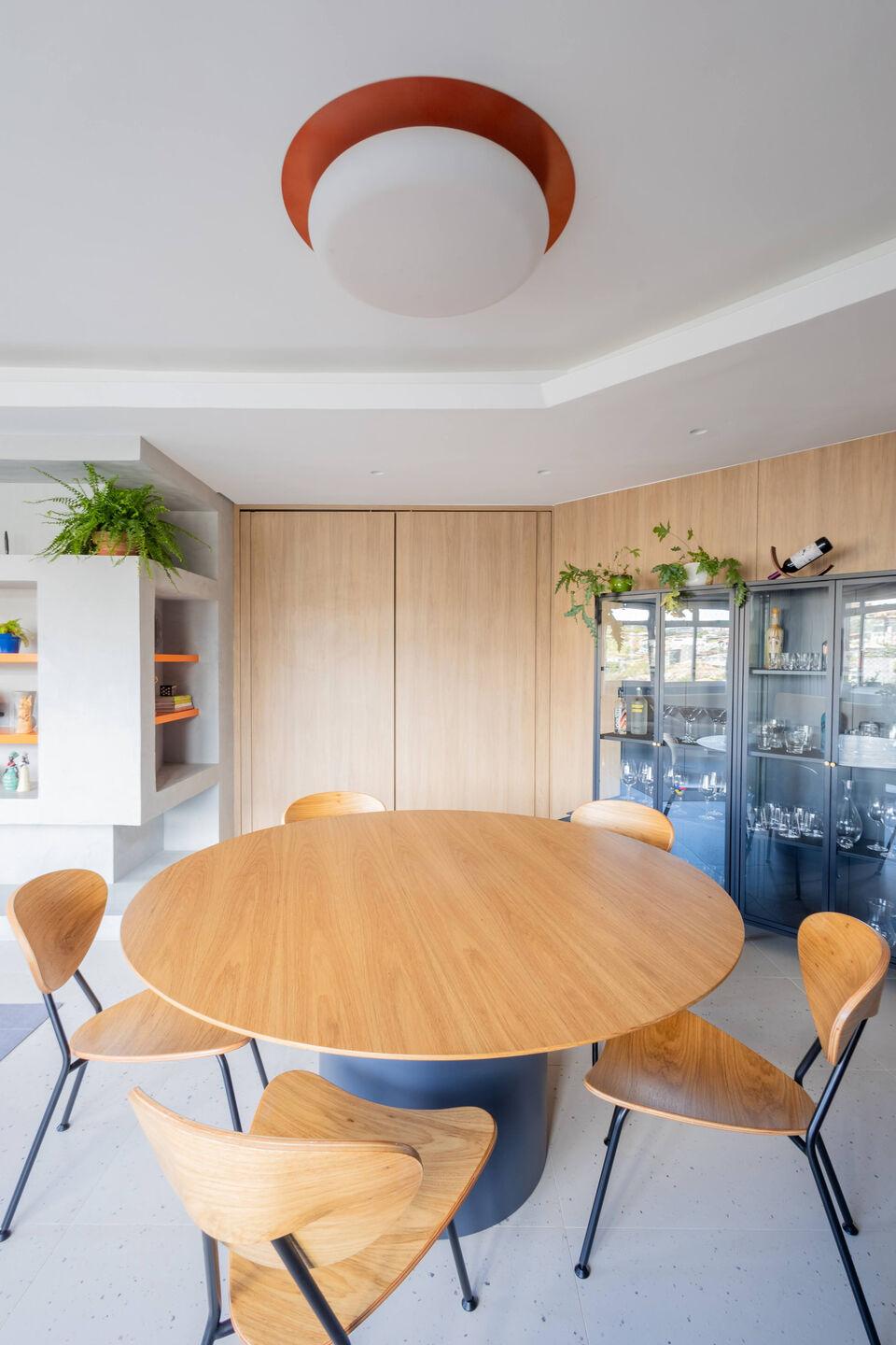 Bàn ăn tròn với mặt gỗ ấm áp kết hợp chân sơn đen hiện đại trở thành điểm nhấn trung tâm. Chi tiết này kết nối giữa khu vực tiếp khách và không gian sinh hoạt gia đình