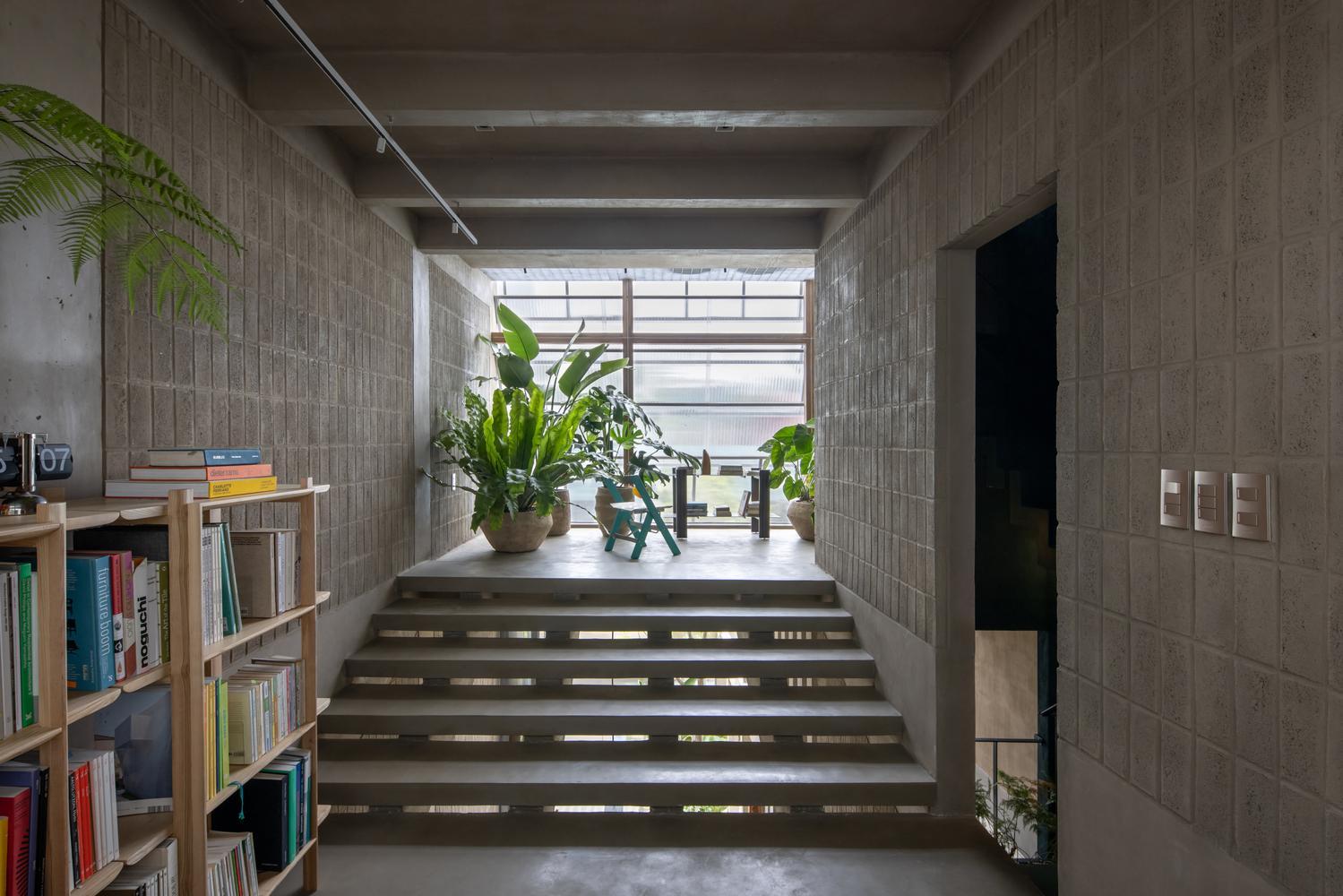 Vẻ đẹp của LÁ-SÁCH House còn đến từ sự tỉ mỉ trong việc lựa chọn và xử lý vật liệu, thể hiện sự trân trọng đối với tay nghề của những người thợ địa phương. Các kiến trúc sư đã sử dụng gạch bê tông không nung, một vật liệu giá thành thấp và thân thiện, nhưng được tính toán tỷ lệ và sắp đặt cẩn trọng trên các bức tường để tạo nên nhịp điệu riêng.