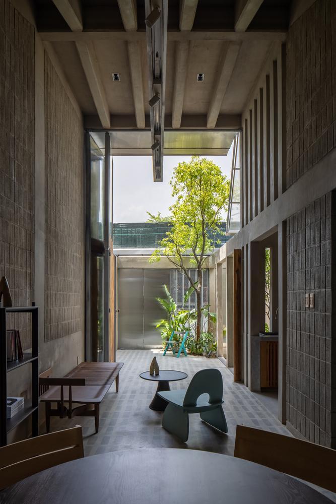 Để giải quyết bài toán về không gian chật hẹp và thiếu sáng thường thấy ở đô thị, đội ngũ thiết kế đã đưa ra những giải pháp xử lý hình khối và vật liệu khéo léo. Thay vì xây dựng hết diện tích đất cho phép, công trình chọn cách lùi lại một chút so với mặt ngõ để tạo ra khoảng thở quý giá cho cả ngôi nhà lẫn khu vực xung quanh. Khoảng lùi này không chỉ giúp giảm bớt cảm giác ngột ngạt của những bức tường bê tông san sát mà còn tạo ra một khoảng đệm nhẹ nhàng.