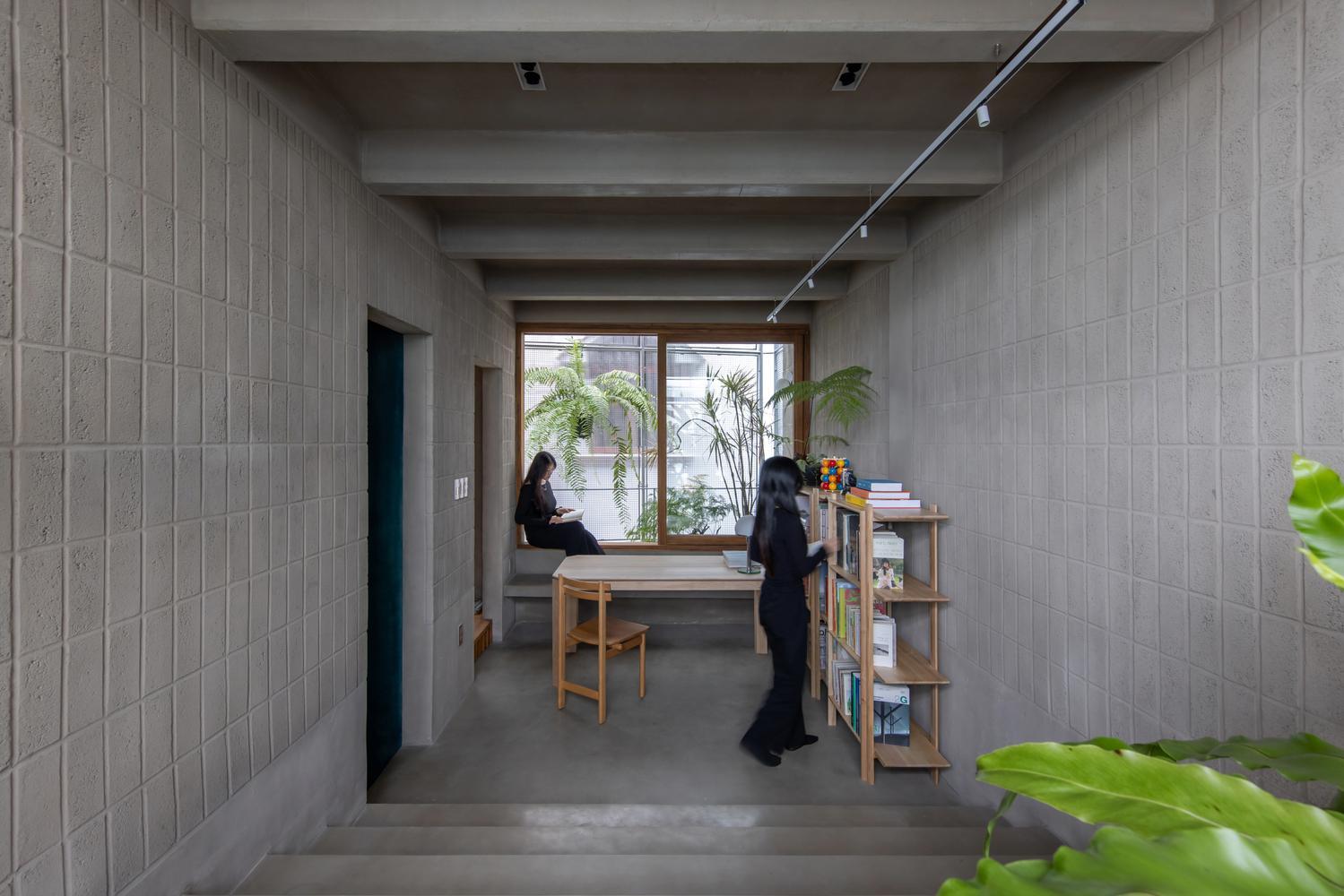Bên trong lớp vỏ bọc độc đáo là cách bố trí mặt bằng khoa học, ưu tiên sự linh hoạt tối đa cho các hoạt động sinh hoạt và văn hóa. Nhóm thiết kế đã gom toàn bộ các hạng mục kỹ thuật và phụ trợ như cầu thang, bếp, nhà vệ sinh và kho vào một lõi bê tông đặt gọn về một phía.