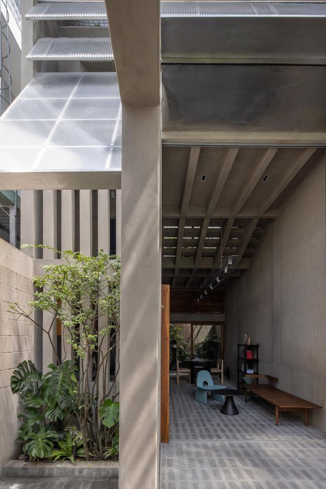 Ngôi nhà lùi nhẹ vào trong, nhường một khoảng sân nhỏ làm không gian đệm thoáng đãng cho con hẻm cụt
