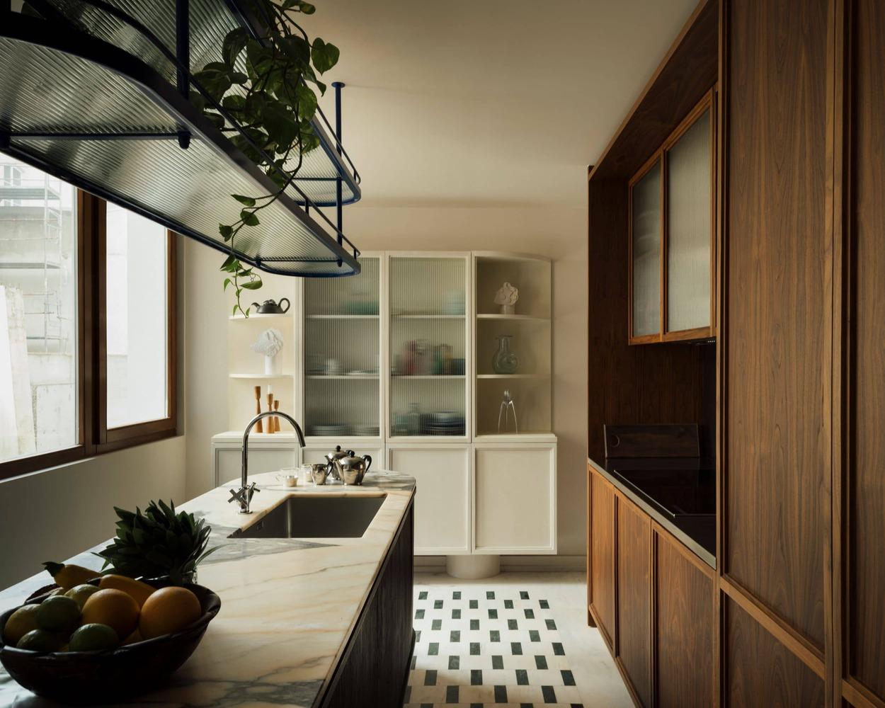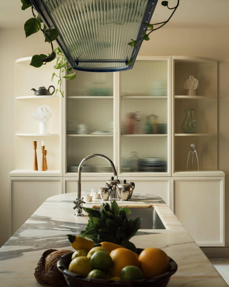 Bàn đảo có hình dáng cong mềm mại, phá vỡ sự cứng nhắc của không gian bếp truyền thống. Hệ tủ cánh kính với các đường rãnh sọc mang âm hưởng Art Deco