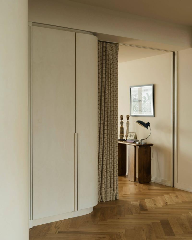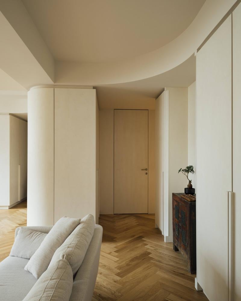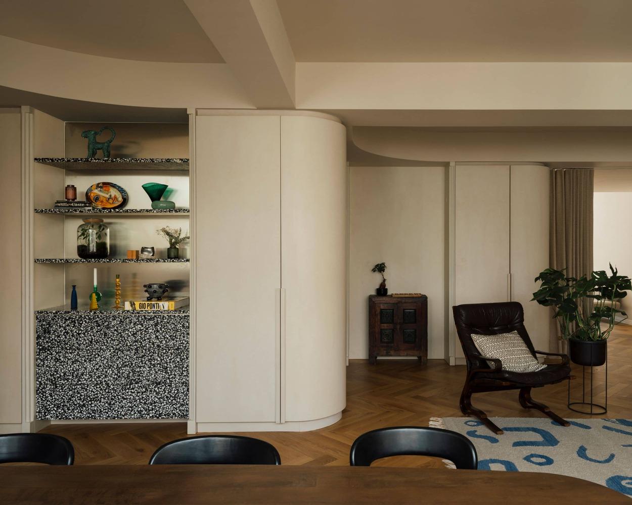 Điều đặc biệt nhất là những bức tường cong. Bên trong mỗi đường cong là những khoang lưu trữ được giấu kín, giống như những bí mật nhỏ của ngôi nhà