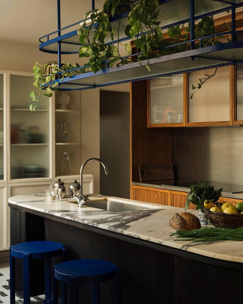 Không gian tạo nên sự cân bằng giữa các vật liệu tự nhiên và các yếu tố công nghiệp. Kệ treo phía trên bàn đảo với khung kim loại màu xanh dương rực rỡ đặt để cây xanh dịu mắt