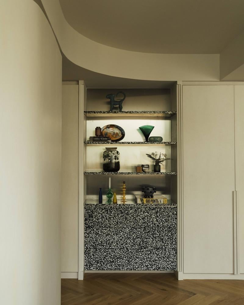 Kệ tủ ốp đá terrazzo tạo cảm giác mạnh mẽ. Cách bài trí mang hơi hướng Mid-century sang trọng