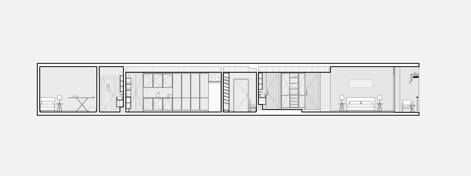 Bố cục của căn hộ được thiết kế theo kiểu bậc thang. Mỗi khu vực có độ cao và mục đích riêng nhưng vẫn kết nối với nhau