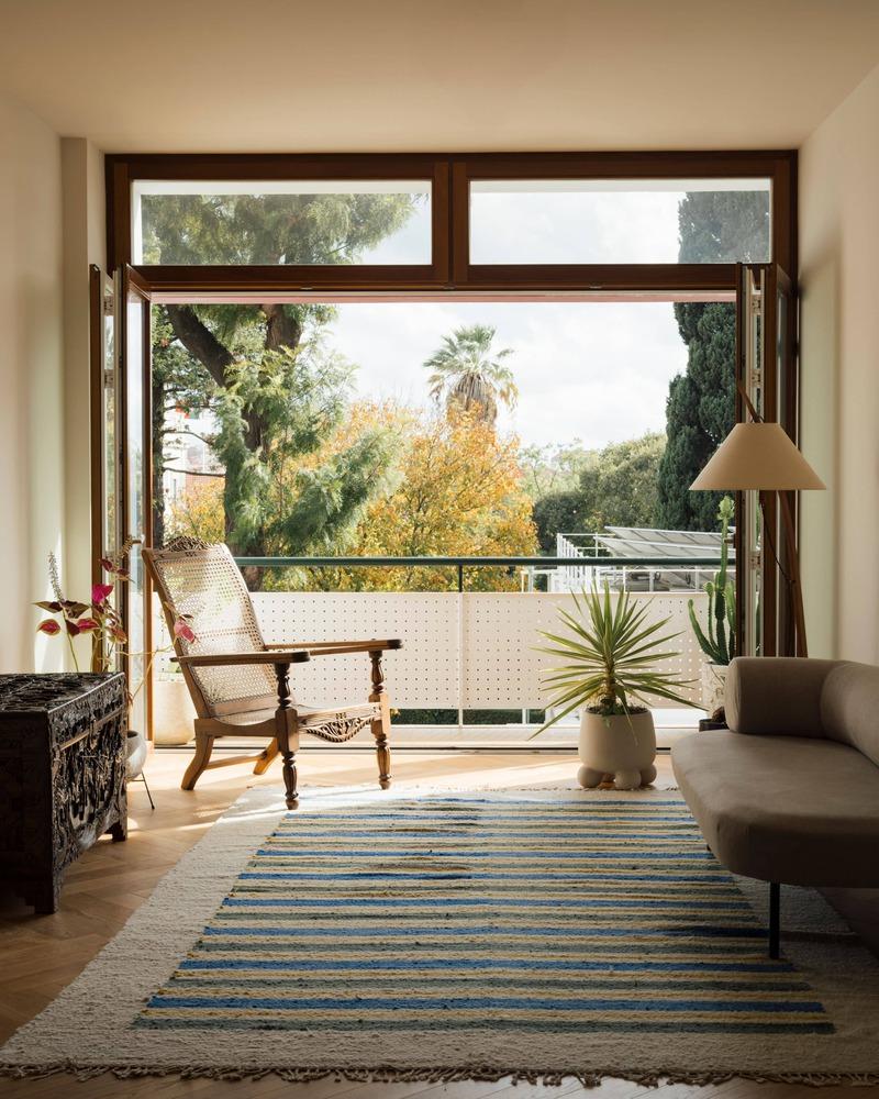 Ghế bành gỗ mây đan tạo cảm giác thư giãn và mộc mạc. Cửa sổ kính lớn khung gỗ mang lại tầm nhìn ra không gian xanh bên ngoài và ánh sáng chan hòa, kết nối không gian trong nhà và ngoài trời