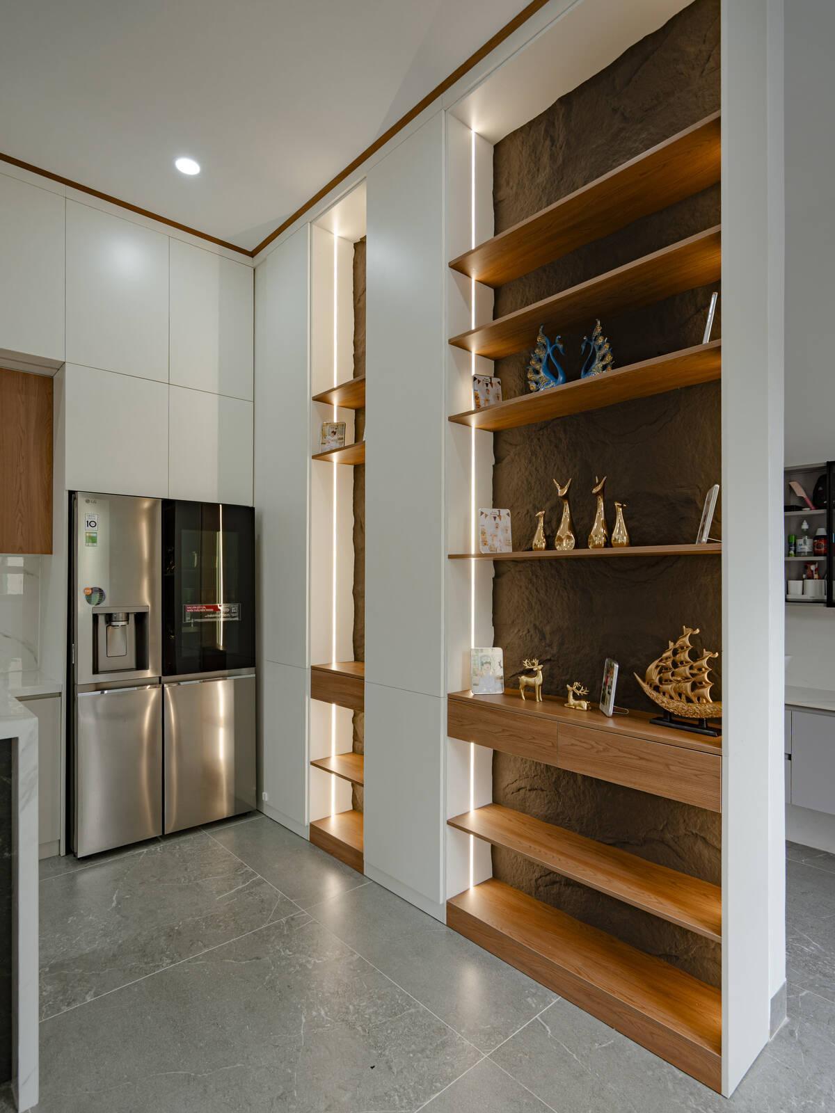 Hệ tủ rượu và tủ trang trí âm tường kết hợp đèn LED chạy dọc, tạo điểm nhấn sang trọng