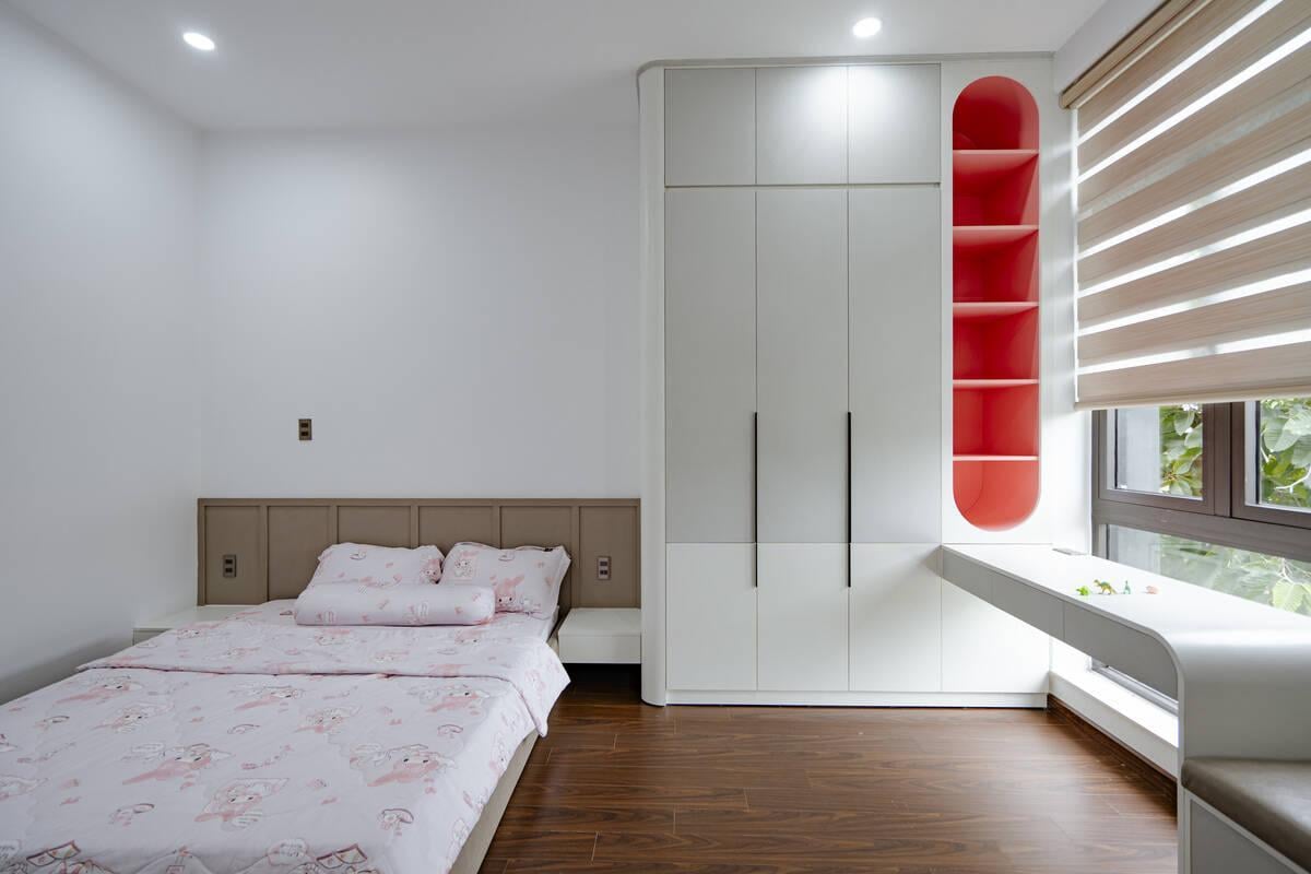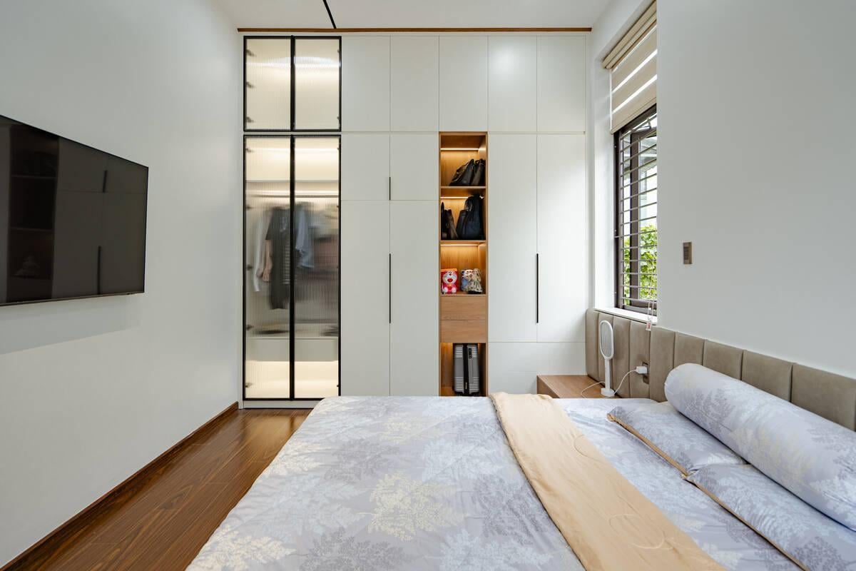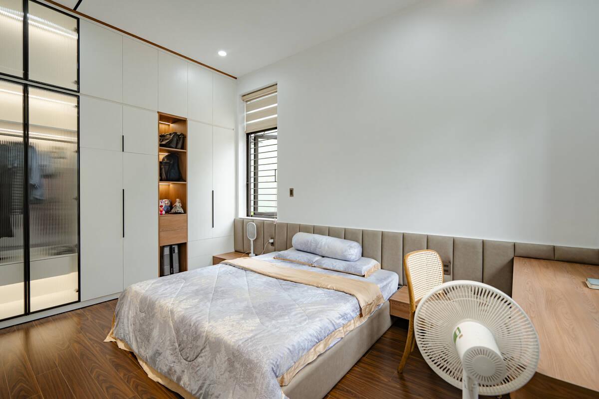 Hệ thống 3 phòng ngủ tại Danh’s House đều tuân thủ nguyên tắc tối giản. Các kiến trúc sư ưu tiên sử dụng các mặt phẳng và khoảng trắng, hạn chế chi tiết rườm rà để tạo cảm giác nhẹ nhàng, thư giãn thị giác sau một ngày làm việc. Đối với phòng ngủ của trẻ em, sự tối giản vẫn được duy trì nhưng điểm xuyết thêm nét vui tươi. Những món đồ chơi, chăn gối họa tiết sinh động trở thành điểm nhấn, kích thích sự sáng tạo của trẻ nhỏ.