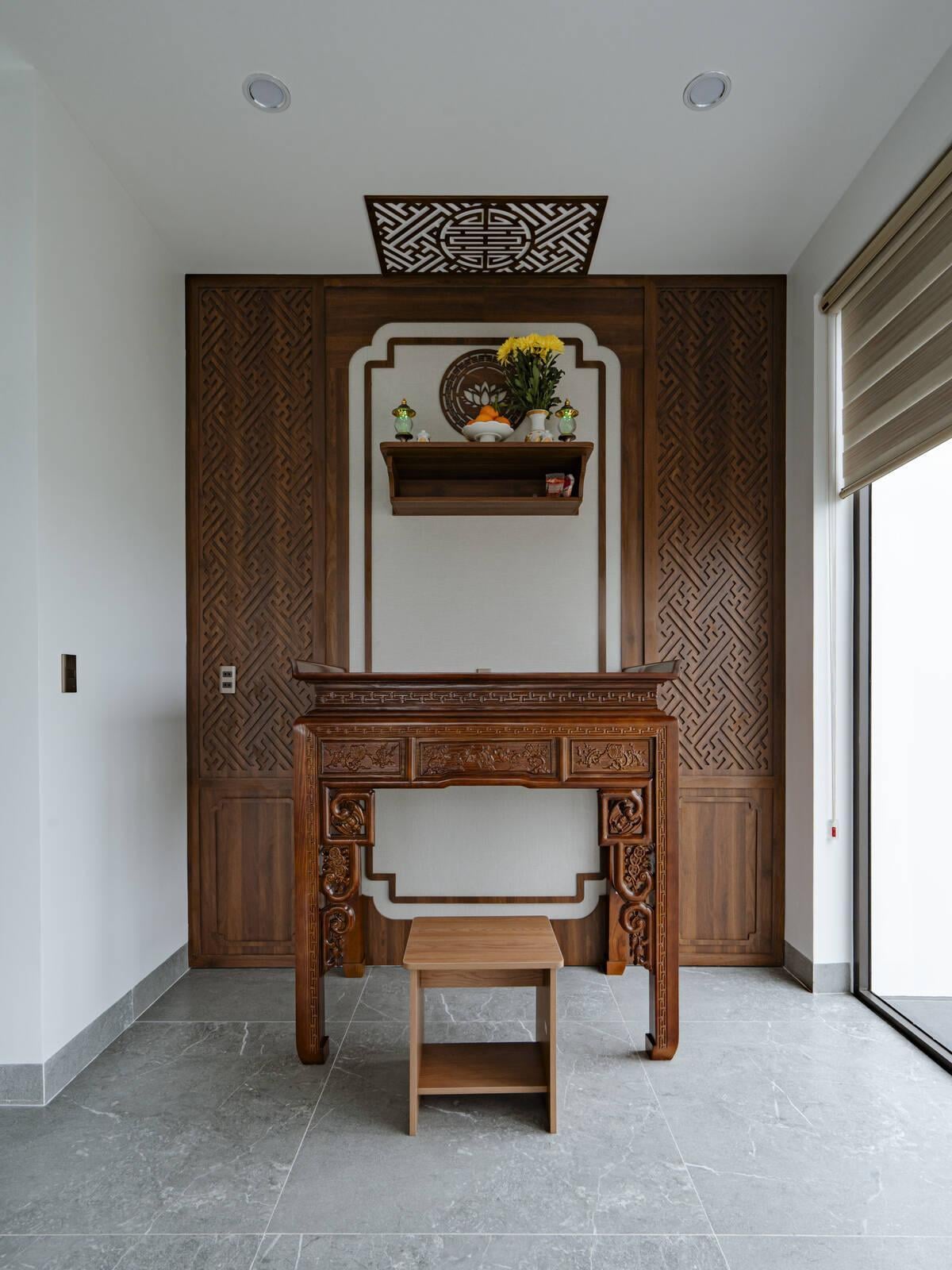 Phòng thờ trang nghiêm với nội thất gỗ tự nhiên được chạm khắc tinh xảo