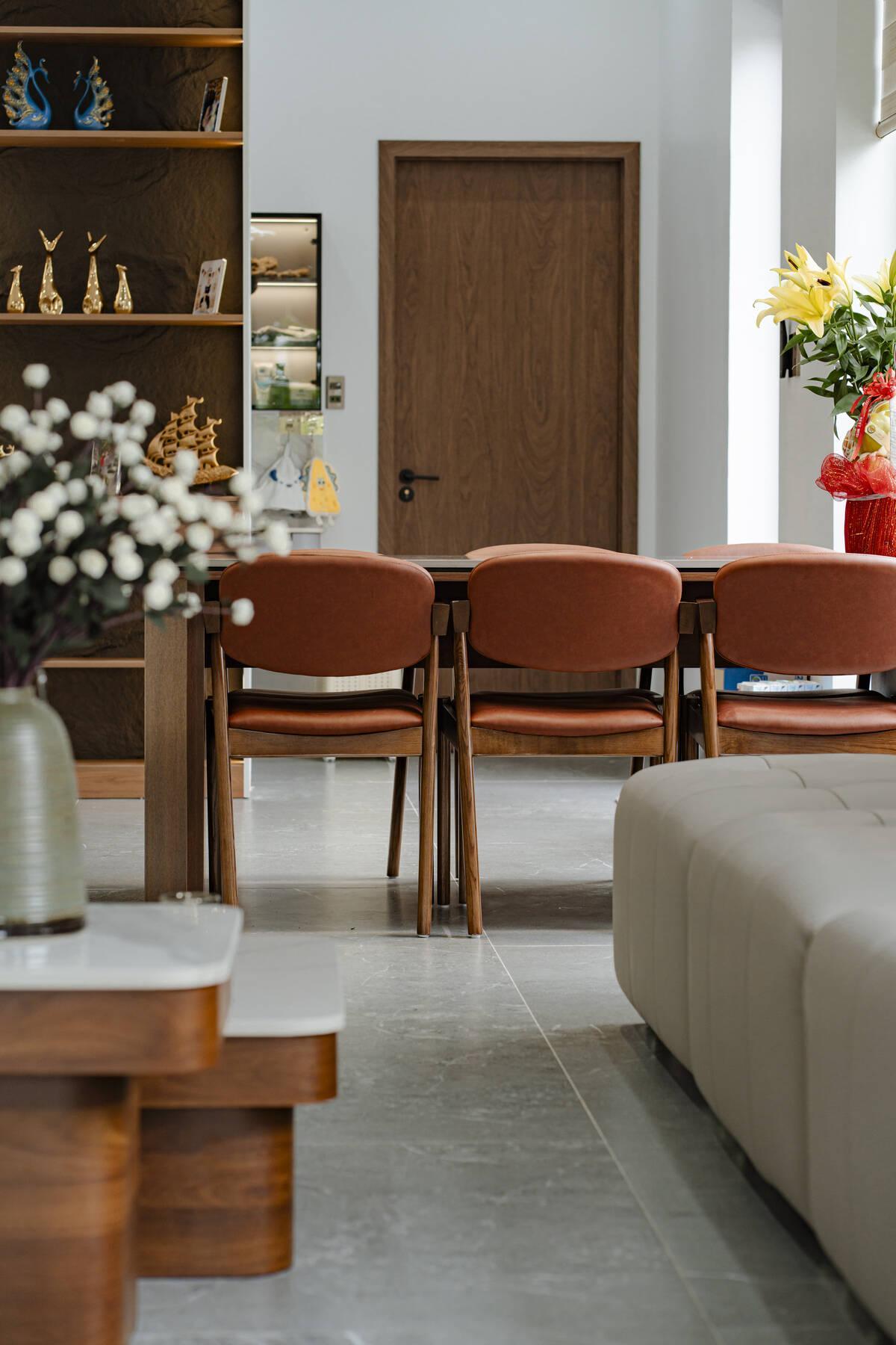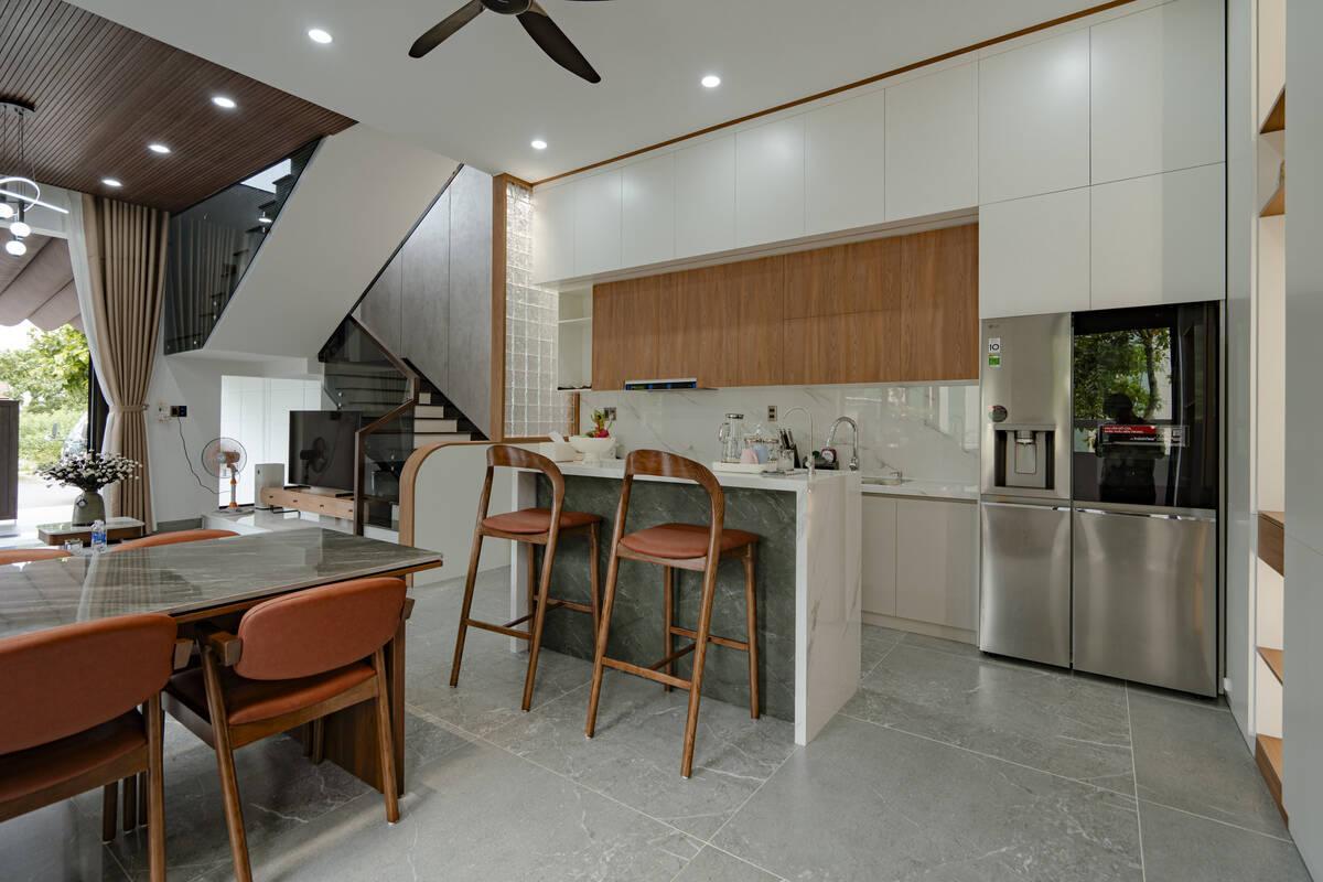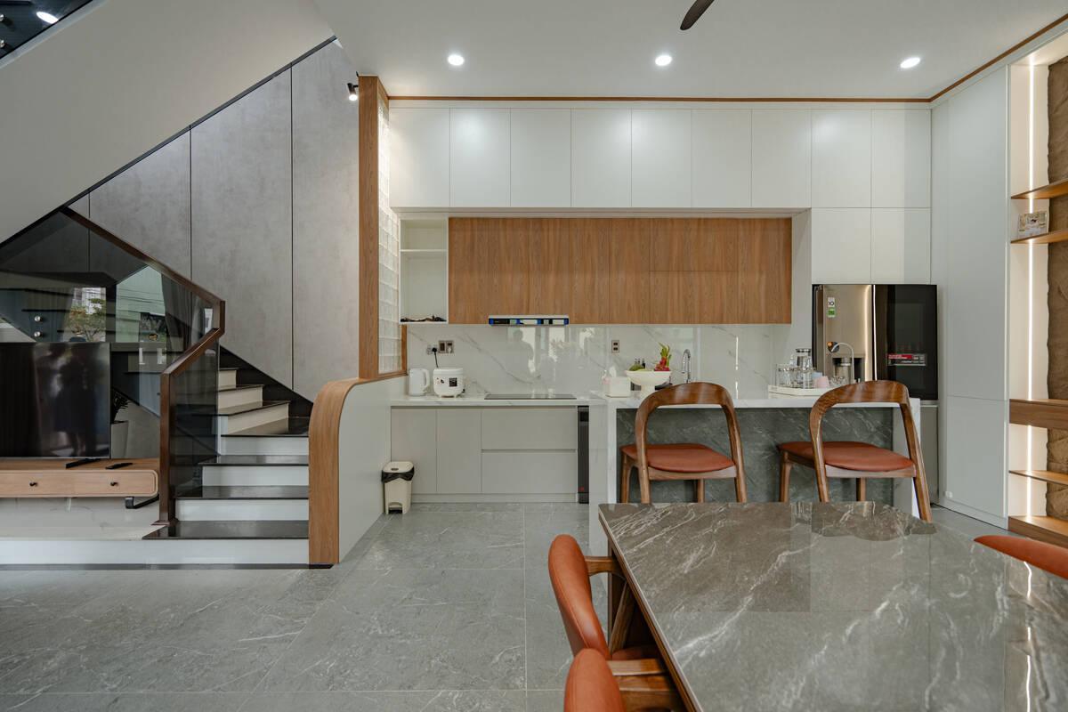 Các chi tiết kim loại đen mờ được đưa vào tinh tế, tạo nên nét hiện đại, mạnh mẽ nhưng vẫn hài hòa với tổng thể chung. Không gian bếp gọn gàng, tiện nghi là nơi giữ lửa cho những bữa cơm gia đình ấm cúng. Rời khỏi sự náo nhiệt của tầng trệt, các không gian riêng tư ở tầng trên được chăm chút kỹ lưỡng để đảm bảo sự thư thái tuyệt đối cho các thành viên.