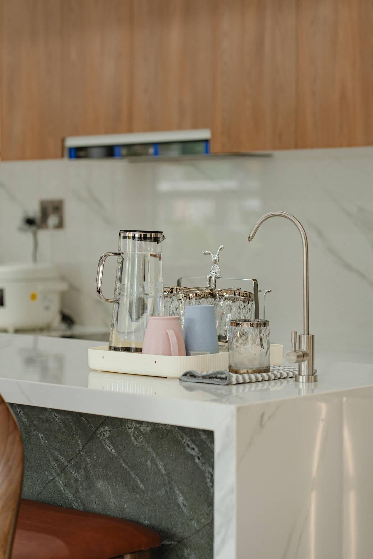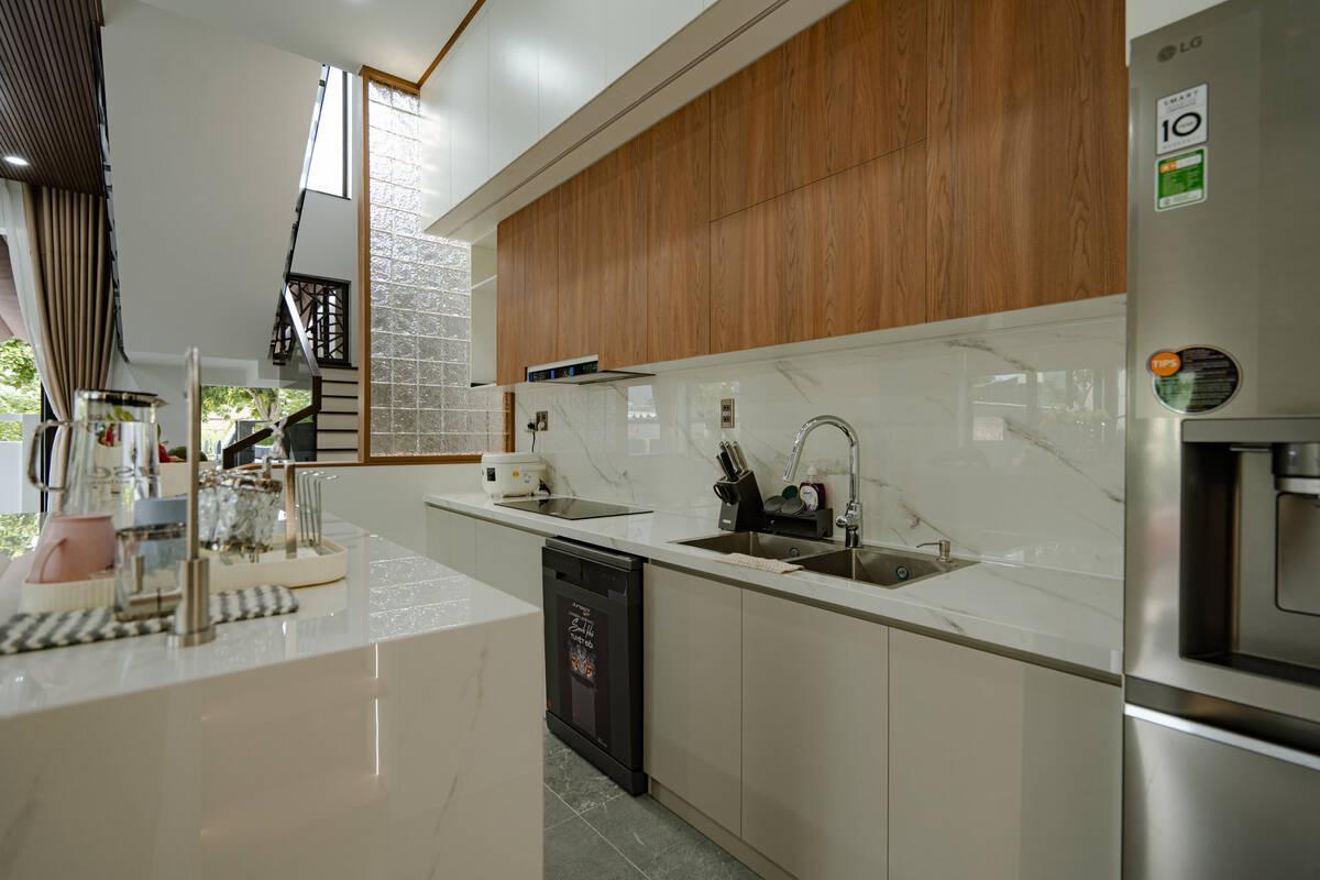 Khu vực chậu rửa và bếp nấu với ốp đá vân mây trắng sạch sẽ, dễ dàng vệ sinh