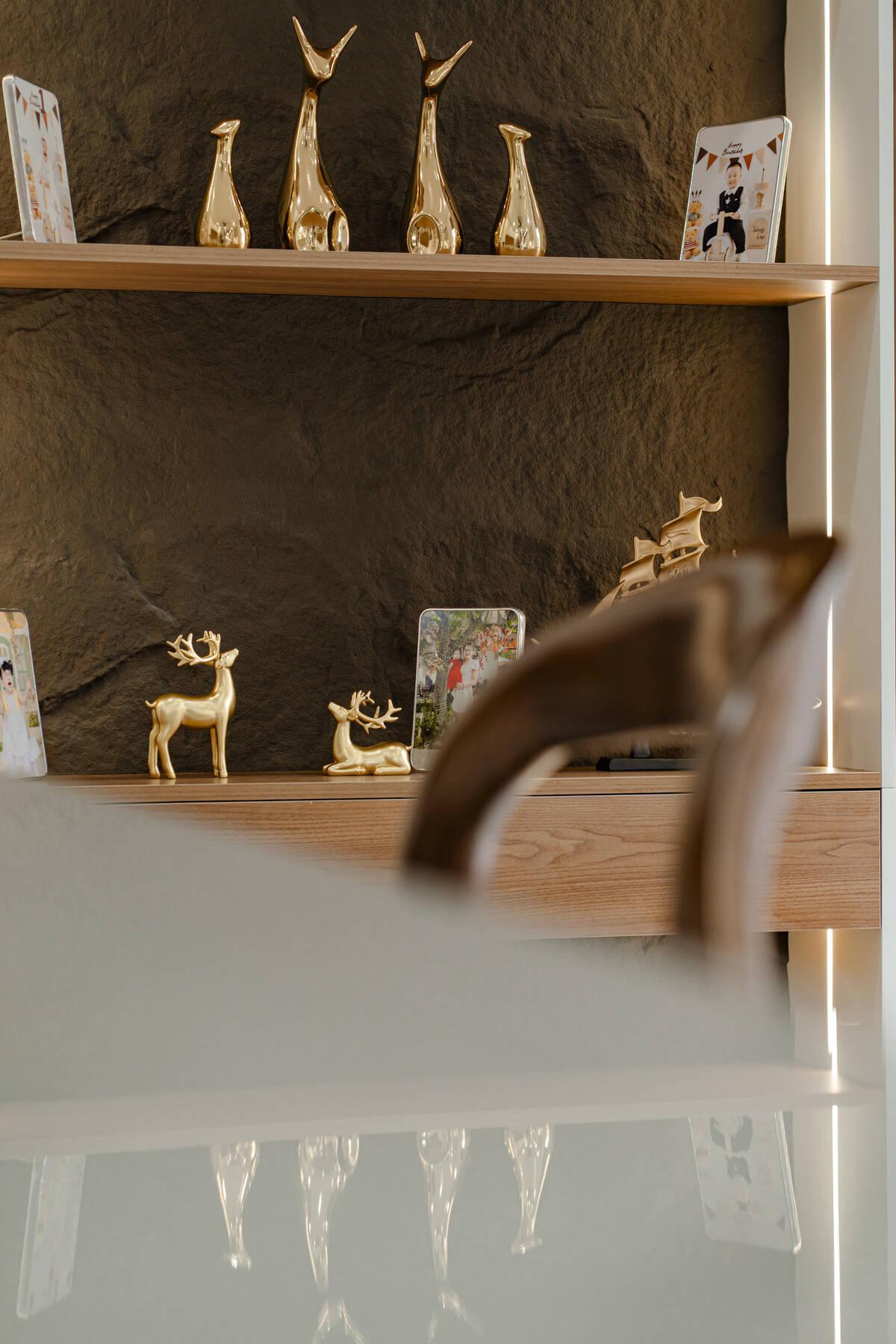 Các món đồ trang trí mạ vàng tinh tế trên kệ tủ phòng ăn