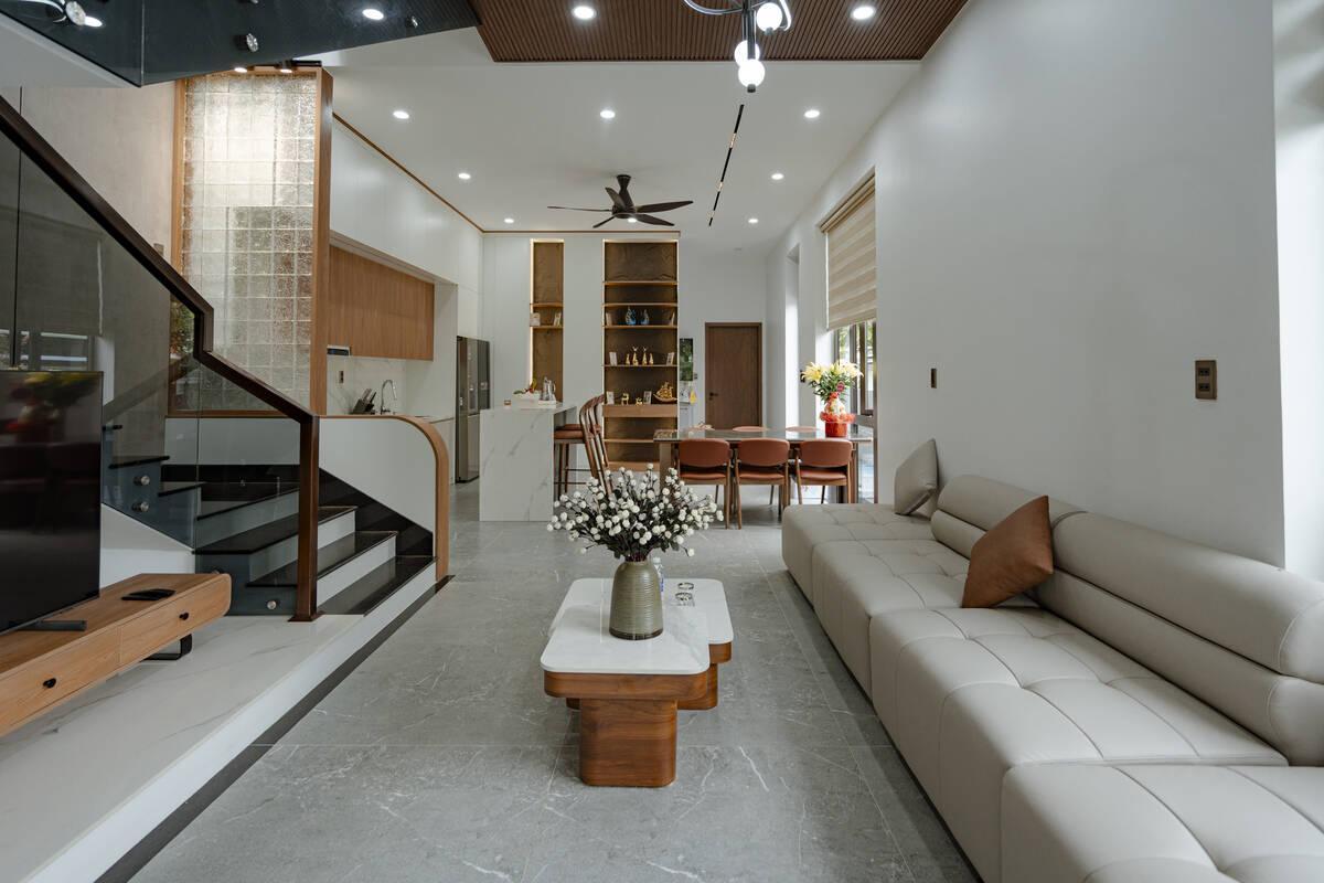 Tầng trệt được quy hoạch theo hướng không gian mở hoàn toàn. Phòng khách, bếp và khu vực bàn ăn liên thông với nhau, không có vách ngăn chia cắt, giúp luồng khí đối lưu tốt hơn từ cửa chính ra sân sau.