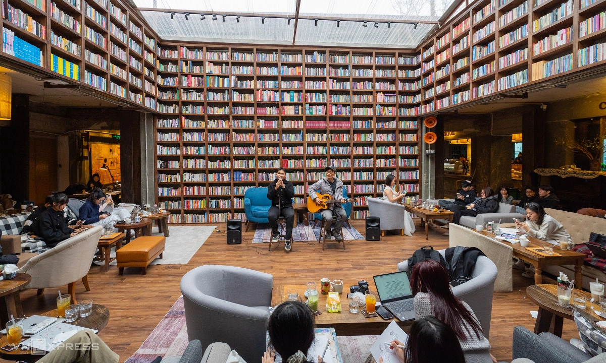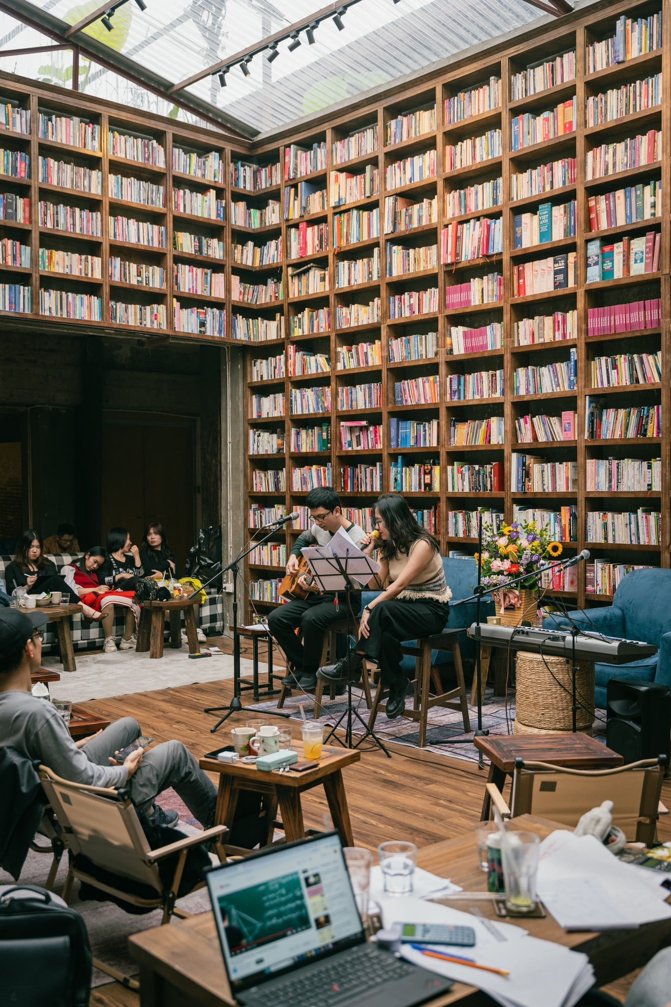 Buổi biểu diễn acoustic diễn ra trước hệ kệ sách lớn, khán giả ngồi xen kẽ khu sofa và bàn cà phê. Hoạt động cộng đồng được tổ chức gọn gàng, không làm mất đi sự yên tĩnh tổng thể của quán.